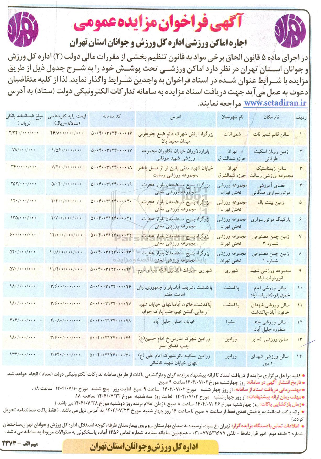 در اجرای ماده 5 قانون الحاق برخی مواد به قانون تنظیم بخشی از مقررات مالی دولت (2) اداره کل ورزش و جوانان استان تهران در نظر دارد اماکن ورزشی تحت پوشش خود را به شرح جدول ذیل از طریق مزایده با شرایط عنوان شده در اسناد فراخوان به واجدین شرایط واگذار نماید. لذا از کلیه متقاضیان دعوت به عمل می آید جهت دریافت اسناد مزایده به سامانه تدارکات الکترونیکی دولت ستاد ایران مراجعه نمایند.