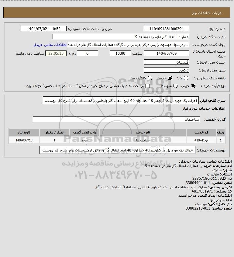 نام دستگاه خریدار:عملیات انتقال گاز مازندران منطقه 9