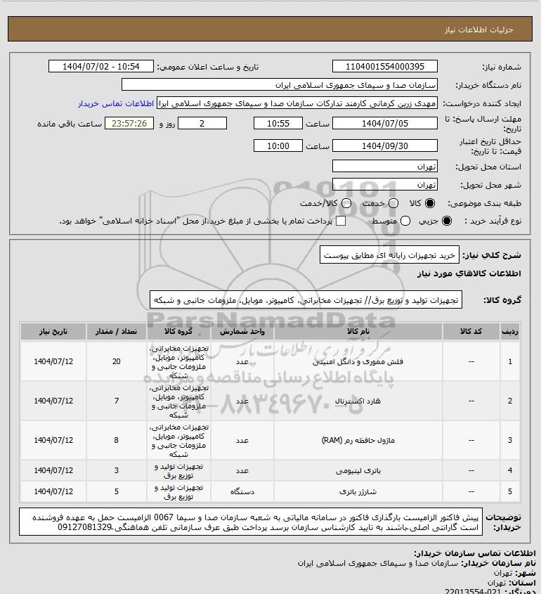 شرح کلی نیاز: خرید تجهیزات رایانه ای مطابق پیوست