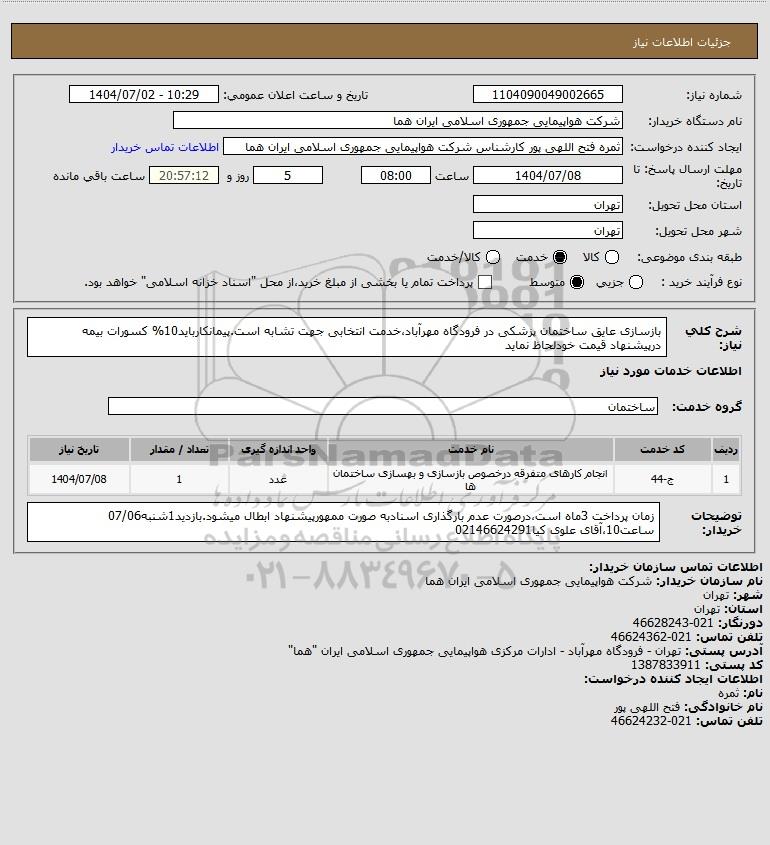 شرح کلی نیاز: بازسازی عایق ساختمان پزشکی در فرودگاه مهرآباد،خدمت انتخابی جهت تشابه است.پیمانکارباید10% کسورات بیمه درپیشنهاد قیمت خودلحاظ نماید