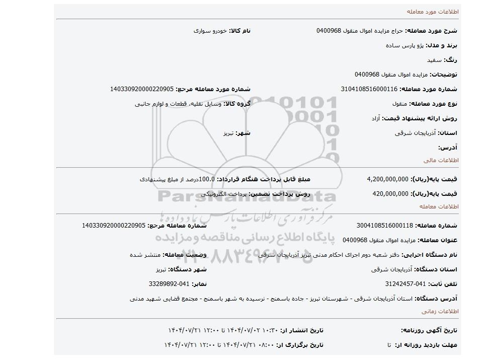 | شرح مورد معامله: حراج مزایده اموال منقول 0400968 | نام کالا: خودرو سواری | |