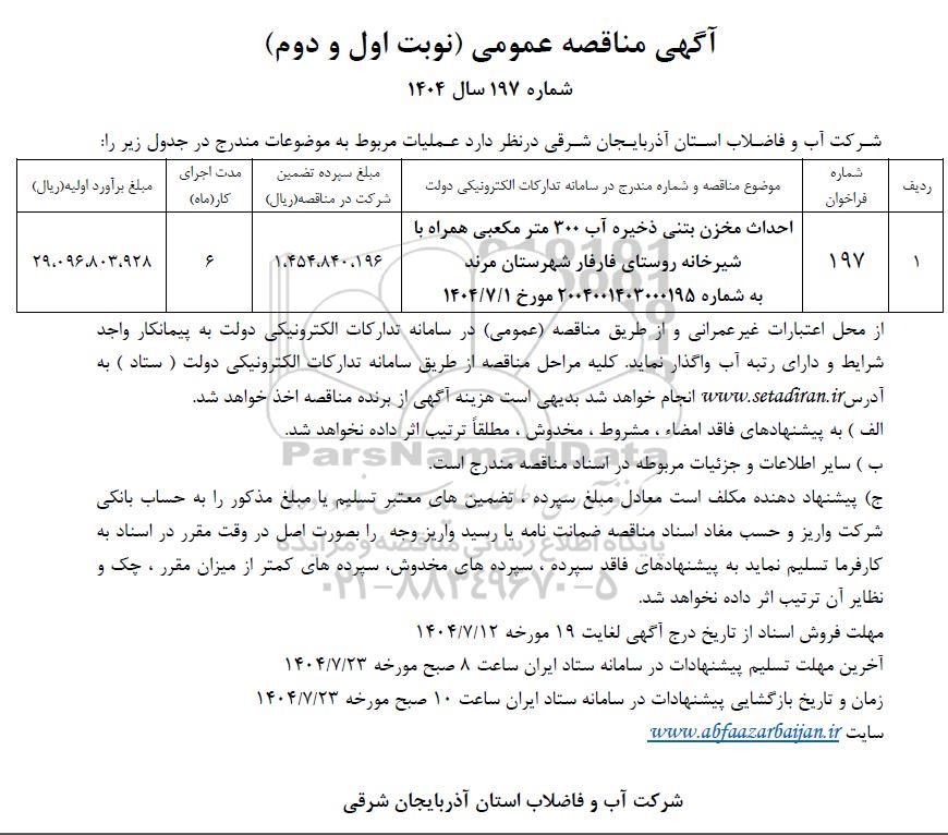 | 1 | 197 | احداث مخزن بتنی ذخیره آب 300 متر مکعبی همراه با شیرخانه روستای فارفار شهرستان مرند به شماره 2004001403000195 مورخ 1404.7.1 |
