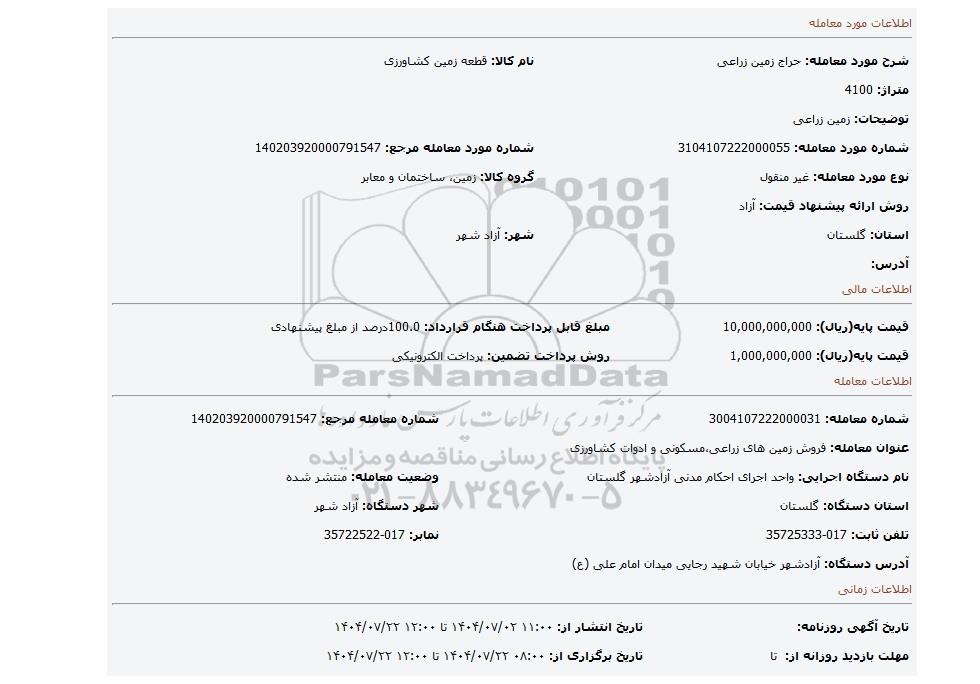 مزایده عمومی مزایده زمین زراعی برگزار میگردد. از کلیه افراد متخصص و شرکت‌های واجد شرایط دعوت به عمل می‌آید تا در این مزایده با کد خبرگزاری پارس نماد : 9594649 شرکت نمایند تاریخ شروع مزایده : 1404/07/02 مهلت شرکت در مزایده: تا پایان روز 1404/07/22 مکان برگزاری اموال واگذاری استان‌های گلستان و دسته‌بندی‌های مربوط به این حراجی ماشین آلات و تجهیزات کشاورزی و دام پروری, املاک و زمین میباشد. اطلاعات دقیق‌تر درباره شرایط شرکت در مزایده آنلاین و نحوه ارسال مدارک، الزامات پروژه و دریافت اسناد مزایده و تاریخ بازگشایی پاکت‌ها، در بخش اطلاعات تکمیلی این آگهی درج شده است.