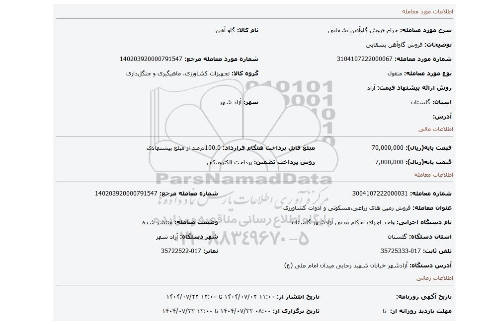 | نام دستگاه اجرایی: واحد اجرای احکام مدنی آزادشهر گلستان | وضعیت معامله: منتشر شده | |