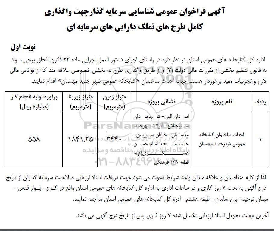 لذا از کلیه متقاضیان و علاقه مندان واجد شرایط دعوت میشود جهت دریافت اسناد ارزیابی صلاحیت سرمایه گذاران از تاریخ درج آگهی به مدت 7 روز کاری و در ساعات اداری به اداره کل کتابخانه های عمومی استان واقع در کرج - بلوار قدس - میدان -توحید برج سامان - طبقه هشتم -ادره کل کتابخانه های عمومی استان مراجعه نمایند.