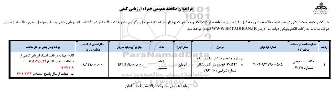 | 1 | مناقصه عمومی 04.35 | 2004092179000505 | بازسازی و تعمیرات کلی یک دستگاه به WRT1 خودرو بنز آتش نشانی شماره شرکتی 2461-201 | آبادان | 4 ماه شمسی | 162.409.000.000 | 8.121.000.000 | الف- مهلت دریافت اسناد ارزیابی کیفی از سامانه ستاد از تاریخ 1404.6.29 لغایت 1404.7.8 ب- مهلت ارسال پاسخ استعلام: مورخ 1404.7.23 |