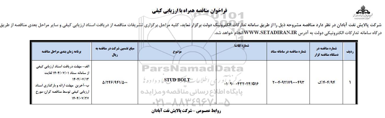 فراخوان مناقصه STUD BOLT از کلیه افراد متخصص و شرکتها واجد شرایط دعوت به عمل میآید در مناقصه با کد خبرگزاری پارس نماد: 9594937 شرکت نمایند.
