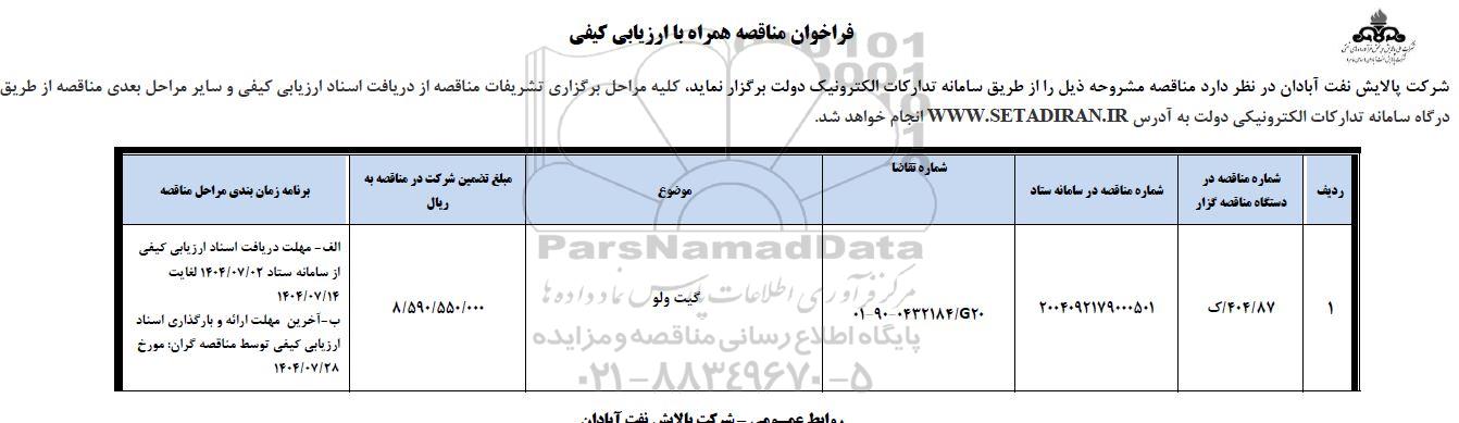 علاقهمندان میتوانند جهت دریافت اسناد و اطلاعات تکمیلی، فراخوان مناقصه گیت ولو با سامانه مناقصات و مزایدات ایران پارسنماد داده ها 88349670 تماس حاصل نمایند.