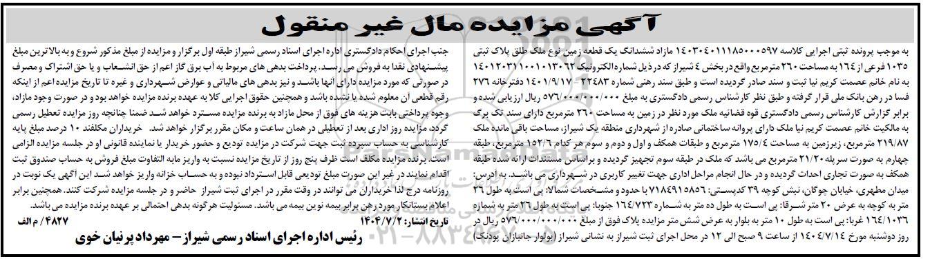آگهی مزایده مال غیر منقول به موجب پرونده ثبتی اجرایی کلاسه 140304011185000597 مازاد ششدانگ یک قطعه زمین نوع ملک طلق پلاک ثبتی 1035 فرعی از 164 به مساحت 260 متر مربع واقع در بخش 4 شیراز که در ذیل شماره الکترونیک 140120311001013062 به نام خانم عصمت کریم نیا ثبت و سند صادر گردیده است و طبق سند رهنی شماره 22483-1401/9/17 دفتر خانه 276 فسا در رهن بانک ملی قرار گرفته و طبق نظر کارشناس رسمی دادگستری به مبلغ 576.000.000./000 ریال ارزیابی شده و برابر گزارش کارشناس رسمی دادگستری قوه قضاییه ملک مورد نظر در زمین به مساحت 260 متر مربع، دارای سند تک برگ به مالکیت خانم عصمت کریم نیا ملک دارای پروانه ساختمانی صادره از شهرداری منطقه یک شیراز مساحت باقی مانده ملک 219/87 متر مربع زیر زمین به مساحت 175/4 متر مربع و طبقات همکف و اول و دوم و سوم هر کدام 152/6 متر مربع ، طبقه چهارم بصورت سرپله 21/20 متر مربع میباشد که ملک در طبقه سوم تجهیز گردیده و بر اساس مستندات ارائه شده طبقه همکف بصورت تجاری احداث گردیده و در حال انجام مراحل اداری جهت تغییر کاربری در شهرداری میباشد به آدرس : میدان مطهری، خیابان چوگان، نبش کوچه 39 کدپستی : 7184915856 با حدود و مشخصات شمالا : پی است بطول 26 متر به کوچه به عرض 20 متر شرقا : پی است بطول ده متر به شماره 164/723 جنوبا : پی است بطول 26 متر به شماره 164/1036 غربا : پی است بطول 10 متر به بلوار به عرض شش متر مزایده پلاک فوق از مبلغ 576.000.000.000 ریال در روز دوشنبه مورخ 1404.7.14 از ساعت 9 صبح الی 12 در محل اجرای ثبت شیراز به نشانی : شیراز، (بلوار جانبازان پودنک) جنب اجرای احکام دادگستری اداره جرای اسناد رسمی طبقه اول اداره برگزار و مزایده از مبلغ مذکور شروع و به بالاترین مبلغ پیشنهادی نقدا به فروش می رسد. پرداخت بدهی های مربوط به آب برق گاز اعم از حق انشعاب و یا حق اشتراک و مصرف در صورتی که مورد مزایده دارای آنها باشد و نیز بدهی های مالیاتی و عوارض شهرداری و غیره تا تاریخ مزایده اعمی از اینکه رقم قطعی آن معلوم شده یا نشده باشد و همچنین حقوق اجرایی کلا به عهده برنده مزایده خواهد بود و در صورت وجود مازاد وجوه پرداختی بابت هزینه های فوق از محل مازاد به برنده مزایده مسترد خواهد شد ضمنا چنانچه روز مزایده تعطیل رسمی گردد مزایده روز اداری بعد از تعطیلی در همان ساعت و مکان مقرر برگزار خواهد شد خریداران مکلفند 10 درصد مبلغ پایه کارشناسی به حساب سپرده ثبت جهت شرکت در مزایده تودیع و حضور خریدار یا نماینده قانونی او در جلسه مزایده الزامی است برنده مزایده مکلف است. ظرف پنج روز از تاریخ مزایده نسبت به واریز مابه التفاوت مبلغ فروش به حساب صندوق ثبت اقدام نمایند در غیر اینصورت مبلغ تودیعی قابل استرداد نبوده و به حساب خزانه واریز خواهد شد این آگهی یک نوبت در روزنامه درج لذا خریداران میتوانند در وقت مقرر در اجرای ثبت شیراز حاضر و در جلسه مزایده شرکت کنند . همچنین برابر اعلام بستانکار مورد رهن برابر بیمه نوین بیمه میباشد مسئولیت هرگونه بدهی احتمالی بر عهده برنده مزایده می باشد.