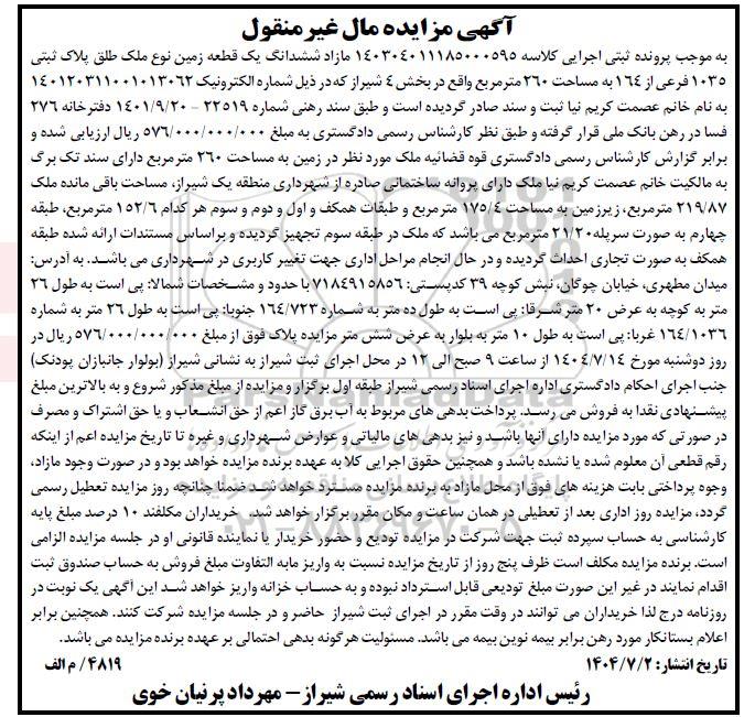 به موجب پرونده ثبتی اجرایی کلاسه 140304011185000595 مازاد ششدانگ یک قطعه زمین نوع ملک طلق پلاک ثبتی 1035 فرعی از 164 به مساحت 260 متر مربع واقع در بخش 4 شیراز که در ذیل شماره الکترونیک 140120311001013062 به نام خانم عصمت کریم نیا ثبت و سند صادر گردیده است و طبق سند رهنی شماره 22519 - 1٤01.9.20 دفترخانه 276 فسا در رهن بانک ملی قرار گرفته و طبق نظر کارشناس رسمی دادگستری به مبلغ 576.000.000.000 ریال ارزیابی شده و برابر گزارش کارشناس رسمی دادگستری قوه قضائیه ملک مورد نظر در زمین به مساحت 260 متر مربع دارای سند تک برگ به مالکیت خانم عصمت کریم نیا ملک دارای پروانه ساختمانی صادره از شهرداری منطقه یک شیراز مساحت باقی مانده ملک 21987 متر مربع زیرزمین به مساحت 175.4 متر مربع و طبقات همکف و اول و دوم و سوم هر کدام ١٥٢.٦ متر مربع طبقه چهارم به صورت سرپله 21.20 متر مربع میباشد که ملک در طبقه سوم تجهیز گردیده و بر اساس مستندات ارائه شده طبقه همکف به صورت تجاری احداث گردیده و در حال انجام مراحل اداری جهت تغییر کاربری در شهرداری می باشد. به آدرس میدان مطهری خیابان چوگان نبش کوچه 39 کدپستی: 71٨٤٩١٥٨٥٦ با حدود و مشخصات شمالا پی است به طول ٢٦ متر به کوچه به عرض 20 متر شرقا پی است به طول ده متر به شماره ١٦٤.723 جنوبا پی است به طول 26 متر به شماره ١٦٤.١٠٣٦ غربا پی است به طول 10 متر به بلوار به عرض شش متر مزایده پلاک فوق از مبلغ 576.000.000.000 ریال در روز دوشنبه مورخ 1404.7.14 از ساعت 9 صبح الی 12 در محل اجرای ثبت شیراز به نشانی شیراز بولوار جانبازان پودنک جنب اجرای احکام دادگستری اداره اجرای اسناد رسمی شیراز طبقه اول برگزار و مزایده از مبلغ مذکور شروع و به بالاترین مبلغ پیشنهادی نقدا به فروش میرسد پرداخت بدهیهای مربوط به آب برق گاز اعم از حق انشعاب و یا حق اشتراک و مصرف در صورتی که مورد مزایده دارای آنها باشد و نیز بدهیهای مالیاتی و عوارض شهرداری و غیره تا تاریخ مزایده اعم از اینکه رقم قطعی آن معلوم شده یا نشده باشد و همچنین حقوق اجرایی کلا به عهده برنده مزایده خواهد بود و در صورت وجود مازاد وجوه پرداختی بابت هزینه های فوق از محل مازاد به برنده مزایده مسترد خواهد شد ضمنا چنانچه روز مزایده تعطیل رسمی گردد مزایده روز اداری بعد از تعطیلی در همان ساعت و مکان مقرر برگزار خواهد شد. خریداران مکلفند 10 درصد مبلغ پایه کارشناسی به حساب سپرده ثبت جهت شرکت در مزایده تودیع و حضور خریدار یا نماینده قانونی او در جلسه مزایده الزامی است. برنده مزایده مکلف است ظرف پنج روز از تاریخ مزایده نسبت به واریز مابه التفاوت مبلغ فروش به حساب صندوق ثبت اقدام نمایند در غیر این صورت مبلغ تودیعی قابل استرداد نبوده و به حساب خزانه واریز خواهد شد این آگهی یک نوبت در روزنامه درج لذا خریداران میتوانند در وقت مقرر در اجرای ثبت شیراز حاضر و در جلسه مزایده شرکت کنند. همچنین برابر اعلام بستانکار مورد رهن برابر بیمه نوین بیمه میباشد. مسئولیت هر گونه بدهی احتمالی بر عهده برنده مزایده می باشد.