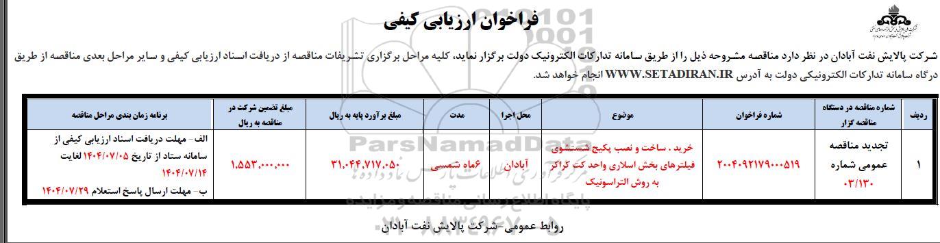 1 تجدید مناقصه عمومی شماره 03/130 2004092179000519 خرید، ساخت و نصب پکیج شستشوی فیلترهای بخش اسلاری واحد کت کراکر به روش آلتراسونیک آبادان 6 ماه شمسی 31.044.717.050 1.553.000.000 الف- مهلت دریافت اسناد ارزیابی کیفی از سامانه ستاد از 1404.7.5 لغایت 1404.07.14