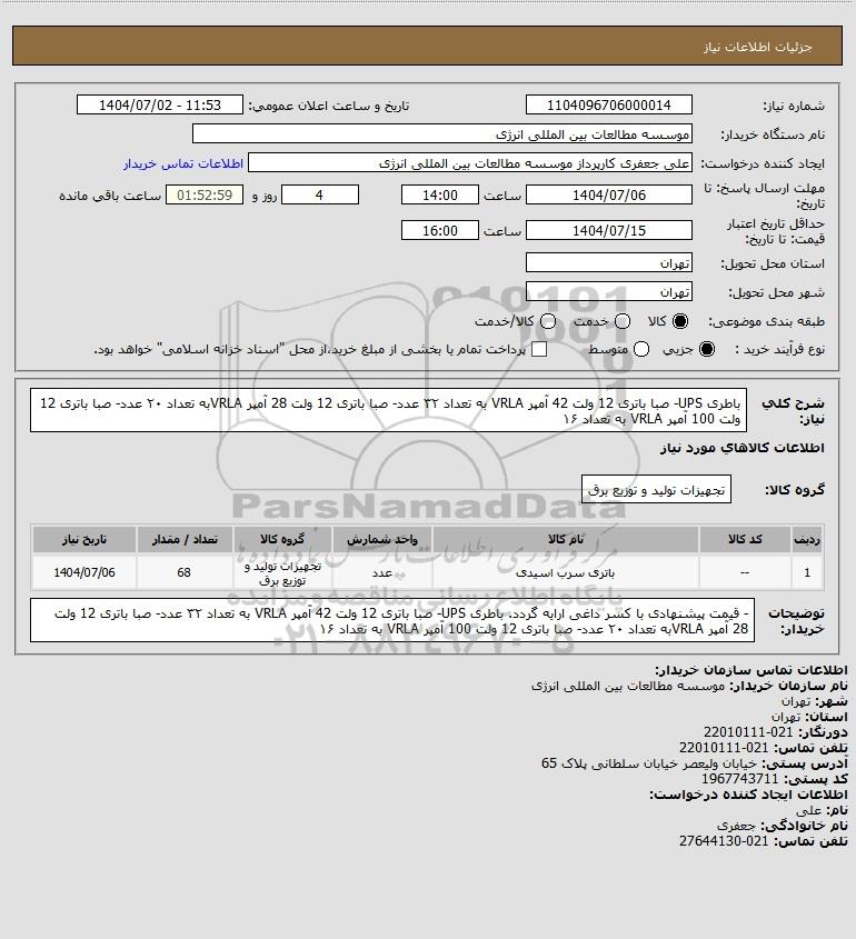 شرح کلی نیاز: باطری UPS- صبا باتری 12 ولت 42 آمپر VRLA به تعداد ۳۲ عدد- صبا باتری 12 ولت 28 آمپر VRLAبه تعداد ۲۰ عدد- صبا باتری 12 ولت 100 آمپر VRLA به تعداد ۱۶