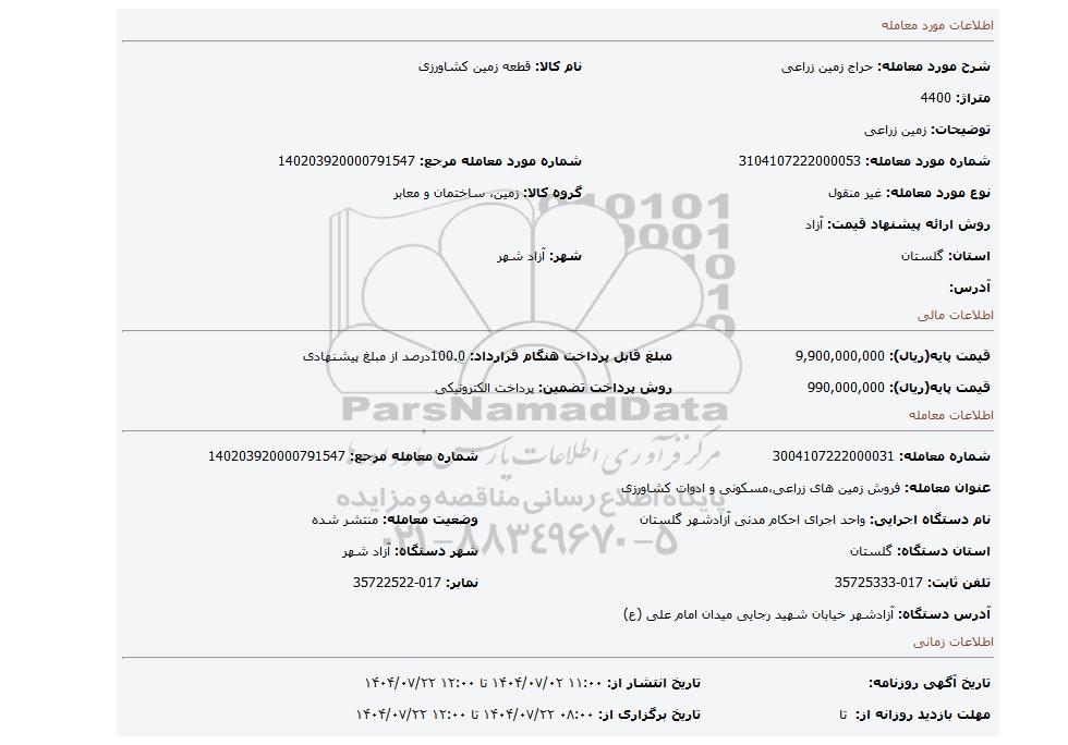 | شرح مورد معامله: حراج زمین زراعی | نام کالا: قطعه زمین کشاورزی | |
