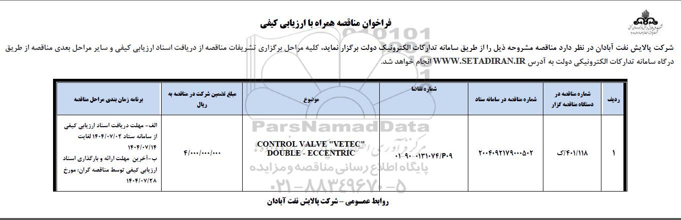 | 1 | 401/118/ک | 2004092179000502 | 01-90-0131074/P09 | CONTROL VALVE "VETEC" DOUBLE - ECCENTRIC | 4.000.000.000 | الف - مهلت دریافت اسناد ارزیابی کیفی از سامانه ستاد 1404.7.2 لغایت 1404.7.14 ب - آخرین مهلت ارائه و بارگذاری اسناد ارزیابی کیفی توسط مناقصه گران: مورخ 1404.7.28 |