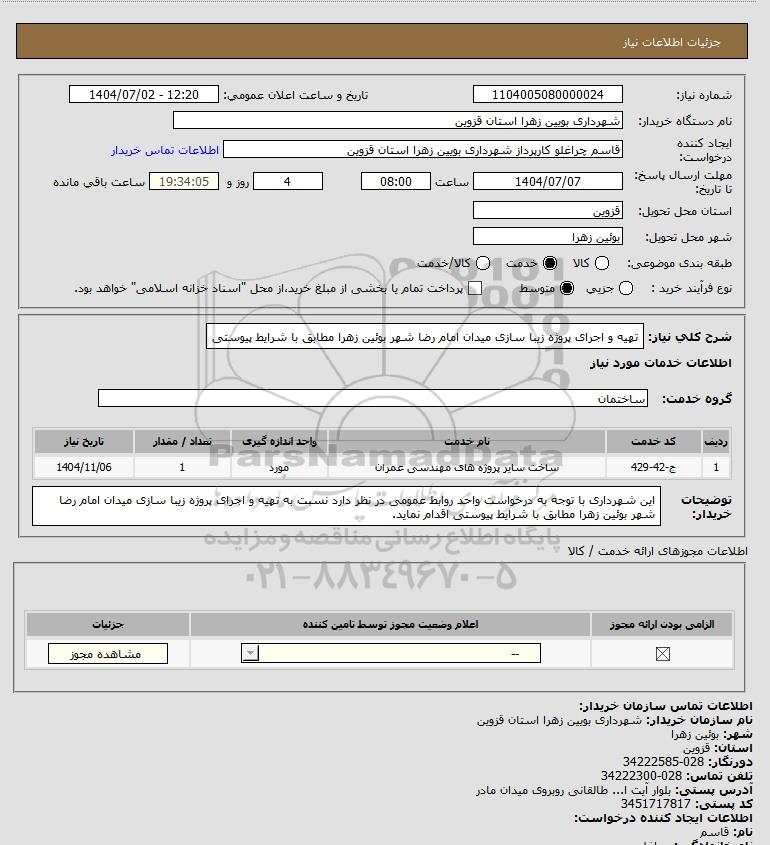 شرح کلی نیاز: تهیه و اجرای پروژه زیبا سازی میدان امام رضا شهر بوئین زهرا مطابق با شرایط پیوستی