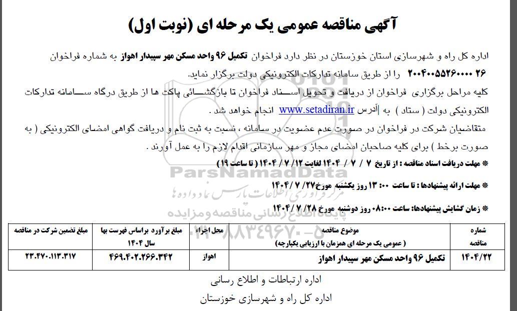 آگهی مناقصه عمومی تجدید شده (نوبت دوم) شماره :1404/04/ ع