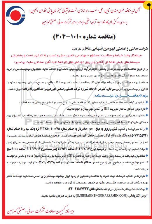 آگهی تمدید مناقصه عمومی مهندسی، تامین ، حمل و نصب، راه اندازی، تست و پشتیبانی سیستم های پایش لحظه ای (آنلاین) بر روی دودکش های کارخانه احیا آهن اسفنجی سایت بردسیر شرکت معدنی و صنعتی گهرزمین