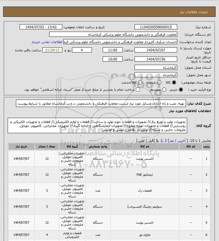 شرح کلی نیاز: تهیه، نصب و راه اندازی وسایل مورد نیاز اینترنت معاونت فرهنکی و دانشجویی د.ع.پ کرمانشاه مطابق با شرایط پیوست