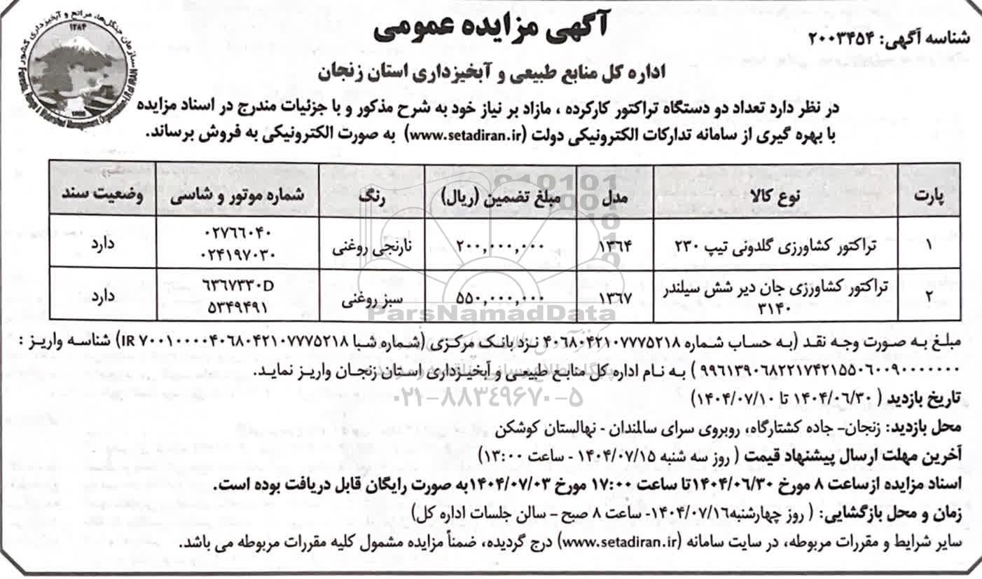 مزایده عمومی مزایده فروش تعداد دو دستگاه تراکتور کارکرده برگزار میگردد. از کلیه افراد متخصص و شرکت‌های واجد شرایط دعوت به عمل می‌آید تا در این مزایده با کد خبرگزاری پارس نماد : 9596063 شرکت نمایند تاریخ شروع مزایده : 1404/06/30 مهلت شرکت در مزایده: تا پایان روز 1404/07/10 مکان برگزاری اموال واگذاری استان‌های زنجان و دسته‌بندی‌های مربوط به این حراجی ماشین آلات و تجهیزات کشاورزی و دام پروری میباشد.