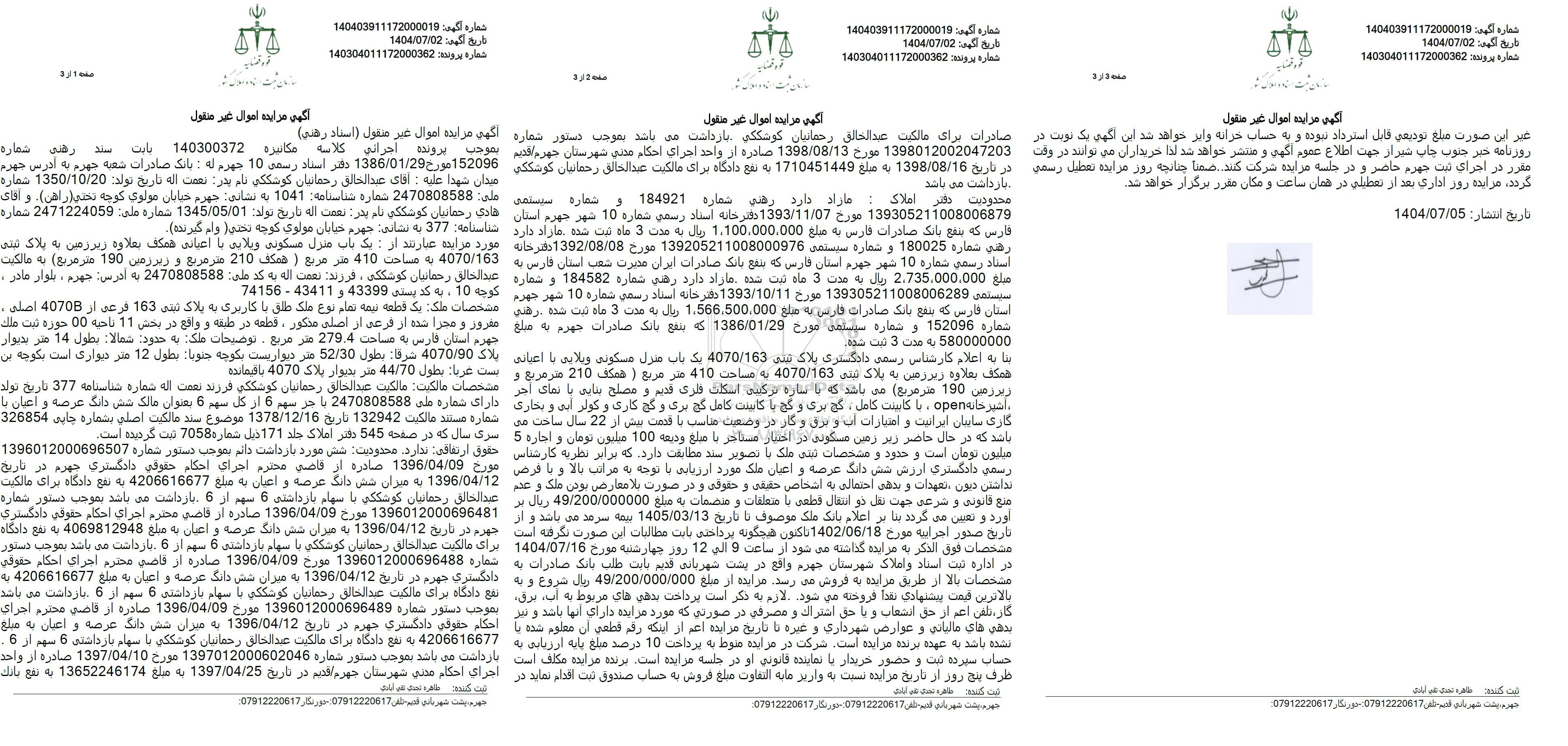 تاریخ مزایده از ساعت 9 الی 12 روز 4شنبه مورخ 1404.07.16 در اداره ثبت اسناد و املاک شهرستان جهرم واقع در پشت شهربانی قدیم بابت طلب بانک صادرات