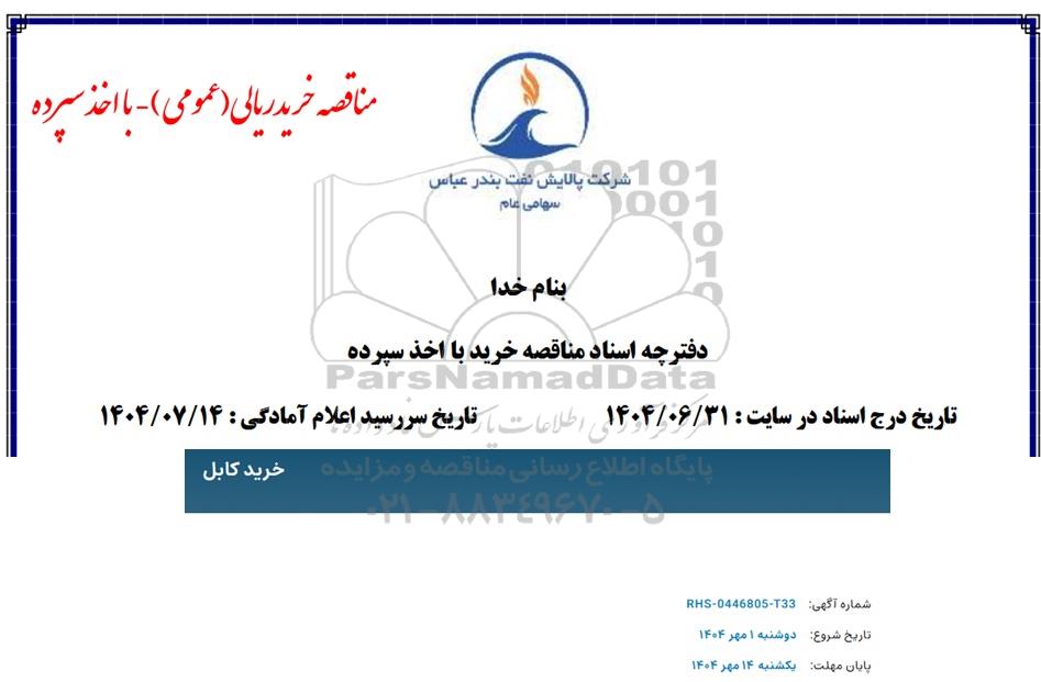 مناقصه خرید کابل از کلیه افراد متخصص و شرکتها واجد شرایط دعوت به عمل میآید در مناقصه با کد خبرگزاری پارس نماد: 9596215 شرکت نمایند.