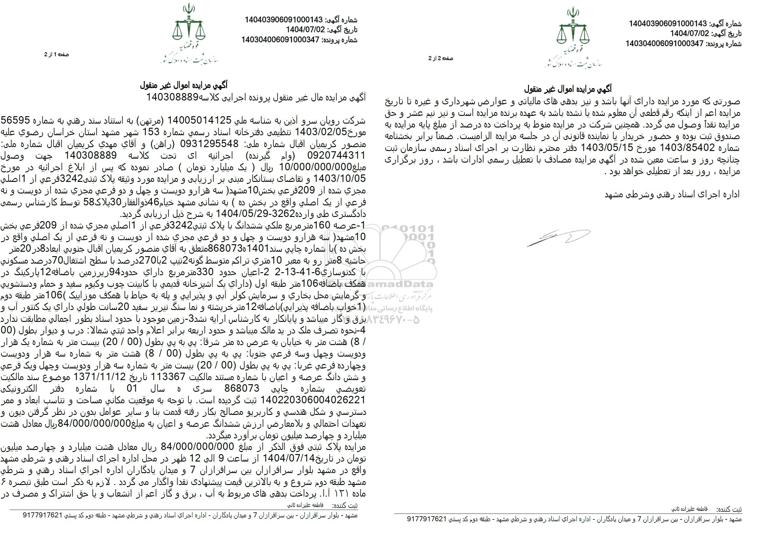 شرکت رویان سرو آذین به شناسه ملی 14005014125 مرتهی به استناد سند رهنی به شماره 56595 مورخ 1403.02.05 تنظیمی دفترخانه اسناد رسمی شماره 153 شهر مشهد استان خراسان رضوی علیه منصور کریمیان اقبال شماره ملی 0931295548 راهن و آقای مهدی کریمیان اقبال شماره ملی: 0920744311 وام گیرنده اجرائیه ای تحت کلاسه 140308889 جهت وصول مبلغ 10.000.000.000 ریال یک میلیارد تومان صادر نموده که پس از ابلاغ اجرائیه در مورخ 1403.10.05 و تقاضای بستانکار مبنی بر ارزیابی و مزایده مورد وثیقه پلاک ثبتی 3242 فرعی از 1 اصلی مجری شده از 209 فرعی بخش 10 مشهد سه هزار و دویست و چهل و دو فرعی مجری شده از دویست و به فرعی از یک اصلی واقع در بخش ده به نشانی مشهد خیام 46 ذو الفقار 30 پلاک 58 توسط کارشناس رسمی دادگستری طی وارده 3262-1404.05.29 به شرح ذیل ارزیابی گردید.
