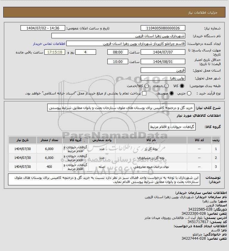توضیحات خریدار:این شهرداری با توجه به درخواست واحد فضای سبز در نظر دارد نسبت به خرید گل و درختچه کامیس برای بوستان های علوی ستارخان بعثت و بانوان مطایق شرایط پیوستی اقدام نماید.