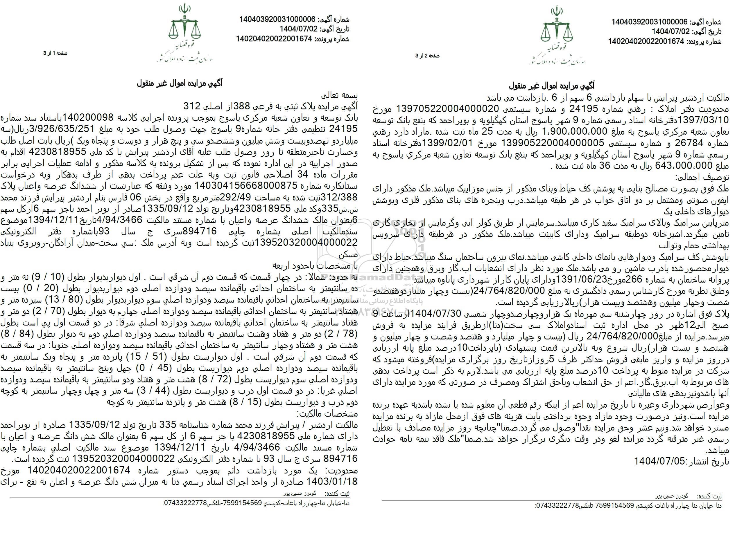 آگهی مزایده پلاک ثبتی به فرعی 388 از اصلی 312, آگهی مزایده پلاک ثبتی به فرعی 388 از اصلی 312