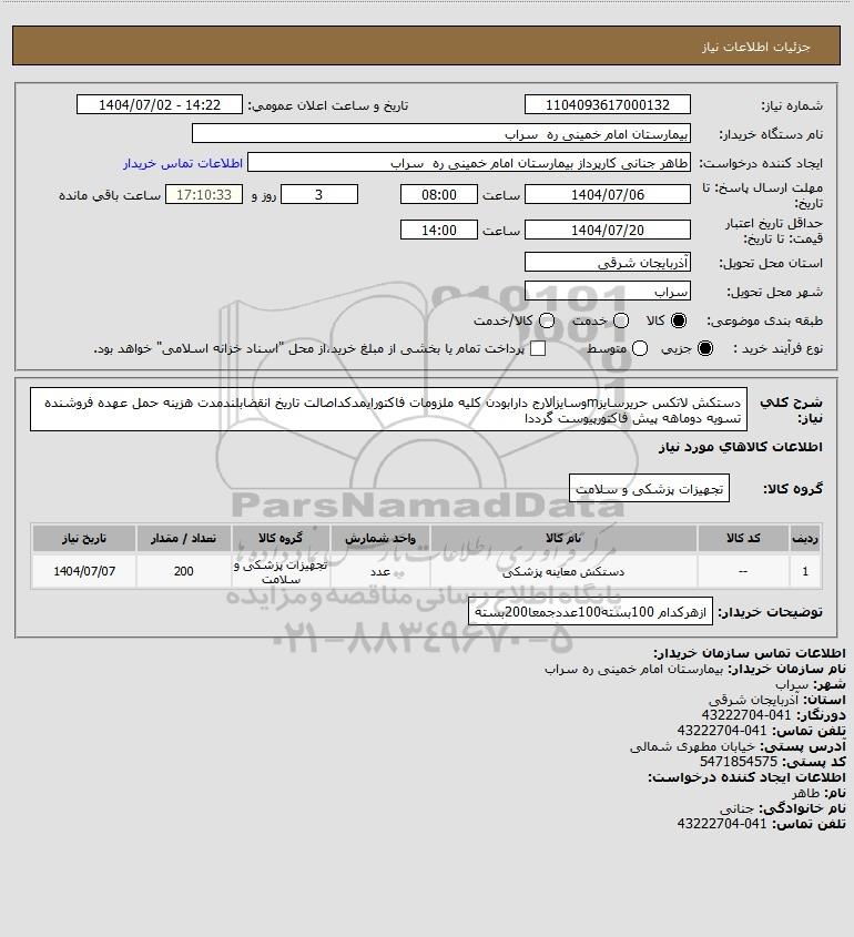 1 -- دستکش معاینه پزشکی عدد تجهیزات پزشکی و سلامت 200 1404/07/07