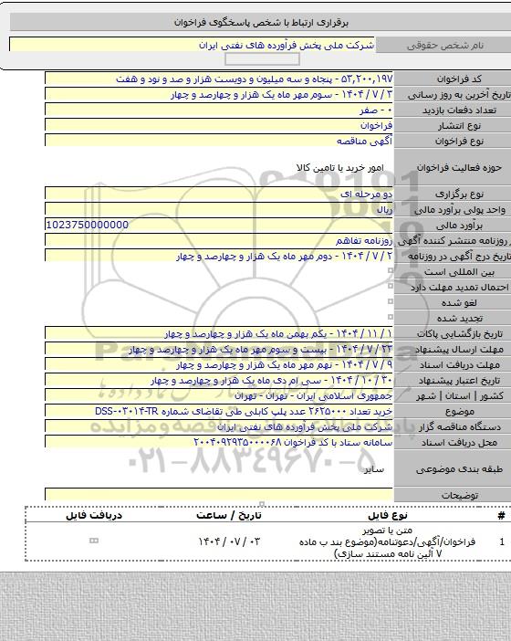 خرید تعداد ۲۶۲۵۰۰۰ عدد پلپ کابلی طی تقاضای شماره DSS-۰۳۰۱۴-TR
