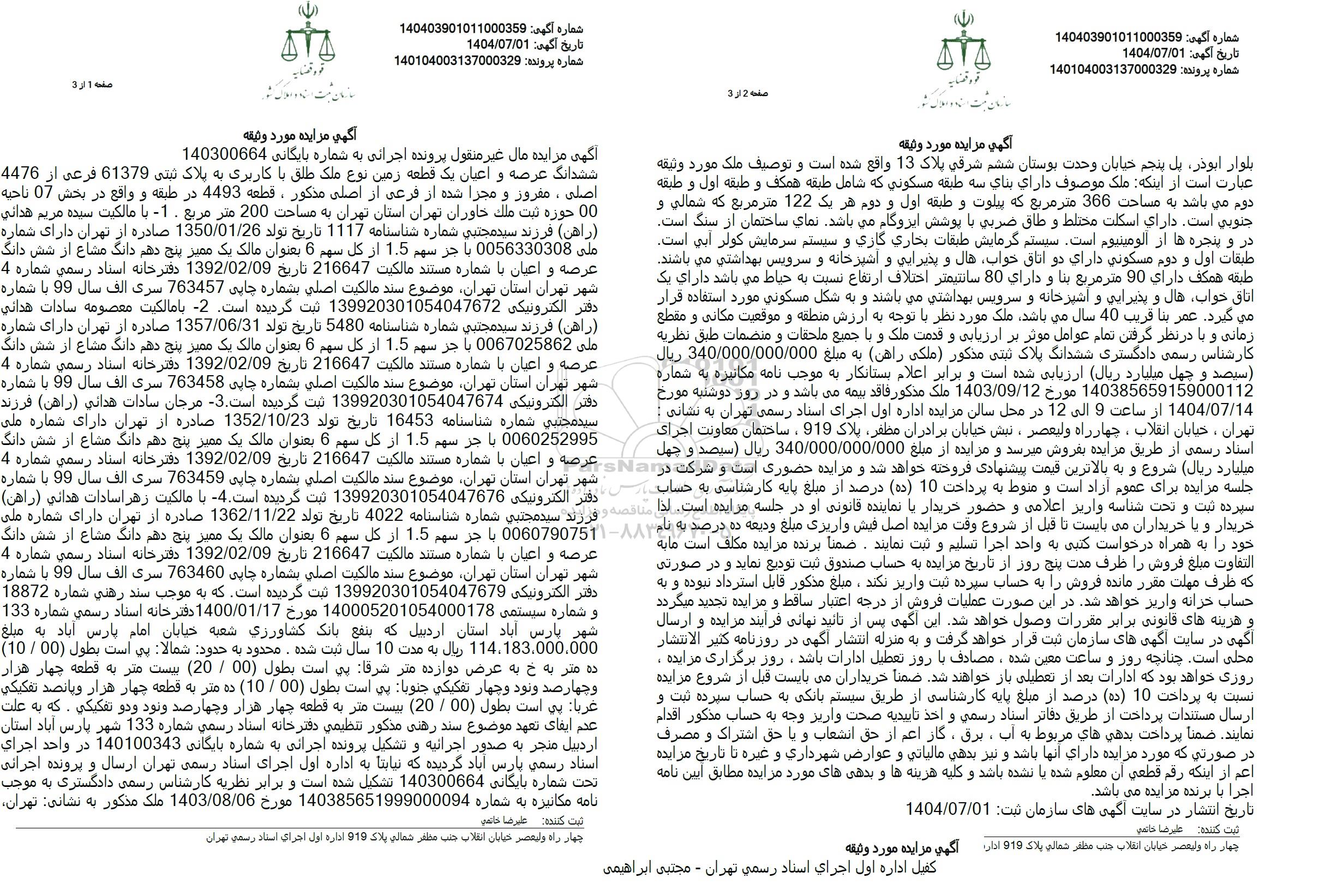 آگهی مزایده مال غیر منقول پرونده اجرائی به شماره بایگانی 140300664 ششدانگ عرصه و اعیان یک قطعه زمین نوع ملک طلق با کاربری به پلاک ثبتی 61379 فرعی از 4476 اصلی ، مفروز و مجزا شده از فرعی از اصلی مذکور ، قطعه 4493 در طبقه و واقع در بخش 07 ناحیه 00 حوزه ثبت ملك خاوران تهران استان تهران به مساحت 200 متر مربع . -1 با مالکیت سيده مريم هدائي (راهن) فرزند سید مجتبی شماره شناسنامه 1117 تاریخ تولد 1350.01.26 صادره از تهران دارای شماره ملی 0056330308 با جز سهم 1.5 از کل سهم 6 بعنوان مالک یک ممیز پنج دهم دانگ مشاع از شش دانگ عرصه و اعیان با شماره مستند مالکیت 216647 تاريخ 1392.02.09 دفترخانه اسناد رسمی شماره 4 شهر تهران استان تهران موضوع سند مالکیت اصلی بشماره چاپی 763457 سری الف سال 99 با شماره دفتر الکترونیکی 139920301054047672 ثبت گردیده است. -2 با مالکیت معصومه سادات هدائي (راهن) فرزند سید مجتبی شماره شناسنامه 5480 تاریخ تولد 1357.06.31 صادره از تهران دارای شماره ملی 0067025862 با جز سهم 1.5 از کل سهم 6 بعنوان مالک یک ممیز پنج دهم دانگ مشاع از شش دانگ عرصه و اعیان با شماره مستند مالکیت 216647 تاریخ 1392.02.09 دفترخانه اسناد رسمی شماره 4 شهر تهران استان تهران موضوع سند مالکیت اصلی بشماره چاپی 763458 سری الف سال 99 با شماره دفتر الکترونیکی 139920301054047674 ثبت گردیده است. 3- مرجان سادات هدائي (راهن) فرزند سيد مجتبي شماره شناسنامه 16453 تاریخ تولد 1352.10.23 صادره از تهران دارای شماره ملی 0060252995 با جز سهم 1.5 از کل سهم 6 بعنوان مالک یک ممیز پنج دهم دانگ مشاع از شش دانگ عرصه و اعیان با شماره مستند مالکيت 216647 تاريخ 1392.02.09 دفترخانه اسناد رسمی شماره 4 شهر تهران استان تهران موضوع سند مالکیت اصلی بشماره چاپی 763459 سری الف سال 99 با شماره دفتر الکترونیکی 139920301054047676 ثبت گردیده است. 4- با مالکیت زهراسادات هدائي (راهن) فرزند سید مجتبی شماره شناسنامه 4022 تاریخ تولد 1362.11.22 صادره از تهران دارای شماره ملی 0060790751 با جز سهم 1.5 از کل سهم 6 بعنوان مالک یک ممیز پنج دهم دانگ مشاع از شش دانگ عرصه و اعیان با شماره مستند مالکیت 216647 تاریخ 1392..02.09 دفترخانه اسناد رسمی شماره 4 شهر تهران استان تهران موضوع سند مالکیت اصلی بشماره چاپی 763460 سری الف سال 99 با شماره دفتر الکترونیکی 139920301054047679 ثبت گردیده است که به موجب سند رهني شماره 18872 و شماره سیستمی 140005201054000178 مورخ 1400.01.17 دفترخانه اسناد رسمی شماره 133 شهر پارس آباد استان اردبیل که بنفع بانک کشاورزی شعبه خیابان امام پارس آباد به مبلغ 114.183.000.000 ریال به مدت 10 سال ثبت شده . محدود به حدود شمالا پی است بطول (00 . 10) ده متر به خ به عرض دوازده متر شرقا پي است بطول 00 . 20) بیست متر به قطعه چهار هزار و چهار صد و نود و چهار تفكيكي جنوبا پي است بطول 00 .10) ده متر به قطعه چهار هزار و پانصد تفكيكي غربا پي است بطول 00 / 20 بیست متر به قطعه چهار هزار و چهارصد و نود و دو تفكيكي . که به علت عدم ایفای تعهد موضوع سند رهني مذكور تنظيمي دفترخانه اسناد رسمی شماره 133 شهر پارس آباد استان اردبیل منجر به صدور اجرائیه و تشکیل پرونده اجرائی به شماره بایگانی 140100343 در واحد اجرای اسناد رسمی پارس آباد گردیده که نیابتاً به اداره اول اجرای اسناد رسمی تهران ارسال و پرونده اجرائی تحت شماره بایگانی 140300664 تشکیل شده است و برابر نظریه کارشناس رسمی دادگستری به موجب نامه مکانیزه به شماره 140385651999000094 مورخ 1403.08.06 ملک مذکور به نشانی تهران بلوار ابوذر پل پنجم خیابان وحدت بوستان ششم شرقی پلاک 13 واقع شده است و توصیف ملک مورد وثیقه عبارت است از اینکه ملک موصوف داراي بناي سه طبقه مسکوني که شامل طبقه همکف و طبقه اول و طبقه دوم ميباشد به مساحت 366 متر مربع که پیلوت و طبقه اول و دوم هر یک 122 متر مربع که شمالی و جنوبي است. دارای اسکلت مختلط و طاق ضربی با پوشش ایزوگام می باشد نمای ساختمان از سنگ است. در و پنجره ها از آلومینیوم است. سیستم گرمایش طبقات بخاری گازی و سیستم سرمایش کولر آبی است. طبقات اول و دوم مسكوني داراي دو اتاق خواب هال و پذیرایی و آشپزخانه و سرویس بهداشتي م