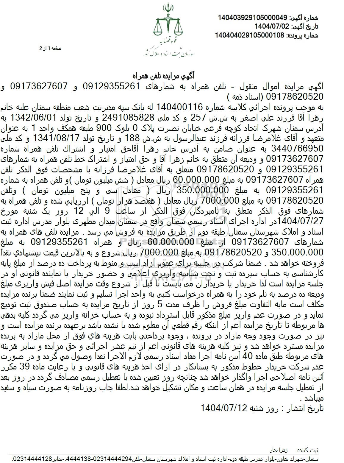 هبه موجب پرونده اجرائی کلاسه شماره 140400116 له بانک سپه مدیریت شعب منطقه سمنان علیه خانم زهرا آقا فرزند علی اصغر به شش 257 و کد ملی 2491085828 و تاریخ تولد 1342.06.01 به آدرس سمنان شهرک اتحاد کوچه فرعی خیابان نصرت پلاک 0 بلوک 900 طبقه همکف واحد 1 به عنوان متعهد و آقای غلامرضا فرزانه فرزند عبدالرسول به شش 188 و تاریخ تولد 1341.08.17 و کد ملی 3440766950 به عنوان ضامن به آدرس خانم زهرا آقاحق امتیاز و اشتراک تلفن همراه شماره 09173627607 و ودیعه آن متعلق به خانم زهرا آقا و حق امتیاز و اشتراک خط تلفن همراه به شمارهای 09129355261 و 09178620520 متعلق به آقای غلامرضا فرزانه با مشخصات فوق الذکر تلفن همراه 09173627607 به مبلغ 60.000.000 ریال معادل ) شش میلیون تومان ) و تلفن همراه به شماره 09129355261 به مبلغ 350.000.000 ریال ) معادل (سی و پنج میلیون تومان) و تلفن 09178620520 به مبلغ 7000.000 ریال معادل (هفتصد هزار تومان) ارزیابی شده و تلفن همراه به شمارهای فوق الذکر متعلق به نامبردگان فوق الذکر از ساعت 9 الی 12 روز یک شنبه مورخ 1404.07.27 در اداره اجرای اسناد رسمی سمنان واقع در سمنان میدان مطهری بلوار مدرس اداره ثبت اسناد و املاک شهرستان سمنان طبقه دوم از طریق مزایده به فروش می رسد. مزایده تلفن های همراه به شمارهای 09173627607 از مبلغ 60.000.000 ریال و همراه 09129355261 به مبلغ 350.000.000 و 09178620520 به مبلغ 7000.000 ریال شروع و به بالاترین قیمت پیشنهادی نقداً فروخته خواهد شد . ضمنا شرکت در جلسه برای عموم آزاد است و منوط به پرداخت ده درصد از مبلغ پایه کارشناسی به حساب سپرده ثبت و تحت شناسه واریزی اعلامی و حضور خریدار با نماینده قانونی او در جلسه مزایده است لذا خریدار یا خریداران می بایست تا قبل از شروع وقت مزایده اصل فیش واریزی مبلغ ودیعه ده در صد به نام خود را به همراه درخواست کتبی به واحد اجرا تسلیم و ثبت نمایند ضمنا برنده مزایده مکلف است ما به التفاوت مبلغ فروش را ظرف مدت 5 روز از تاریخ مزایده به حساب صندوق ثبت تودیع نماید و در صورت عدم واریز مبلغ مذکور قابل استرداد نبوده و به حساب خزانه واریز می گردد کلیه بدهی ها مربوطه تا تاریخ مزایده اعم از اینکه رقم قطعی آن معلوم شده یا نشده باشد بر عهده برنده مزایده است و نیز در صورت وجود وجه مازاد در پرونده، وجوه پرداختی بابت هزینه های فوق از محل مازاد به برنده مزایده مسترد خواهد شد و نیز کلیه هزینه های قانونی اعم از نیم عشر اجرائی و حق مزایده و سایر هزینه های مربوطه طبق ماده 40 آیین نامه اجرا مفاد اسناد رسمى لازم الاجرا نقدا وصول می گردد و در صورت عدم شرکت خریدار خطوط مذکور به بستانکار در ازای اخذ هزینه های قانونی و با رعایت ماده 39 مکرر آئین نامه اصلاحی اجرا واگذار خواهد شد چنانچه روز تعیین شده با تعطیل رسمی مصادف گردد در روز بعد از تعطیل جلسه مزایده در همان ساعت و مکان تشکیل خواهد شد. لطفا چاپ روزنامه به صورت سیاه و سفید میباشد.