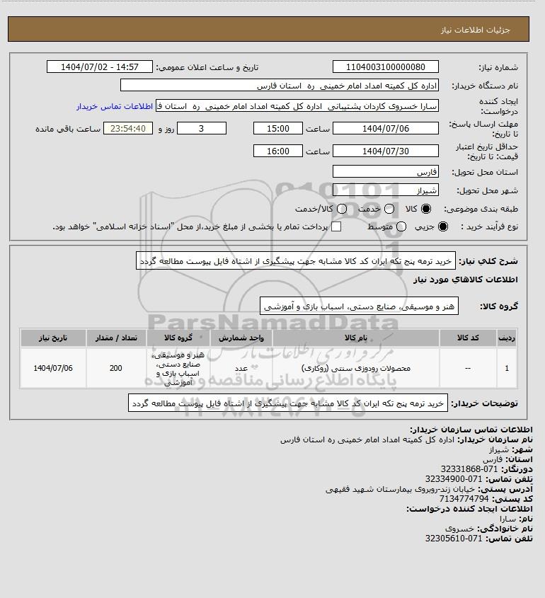 نام دستگاه خریدار:اداره کل کمیته امداد امام خمینی ره استان فارس