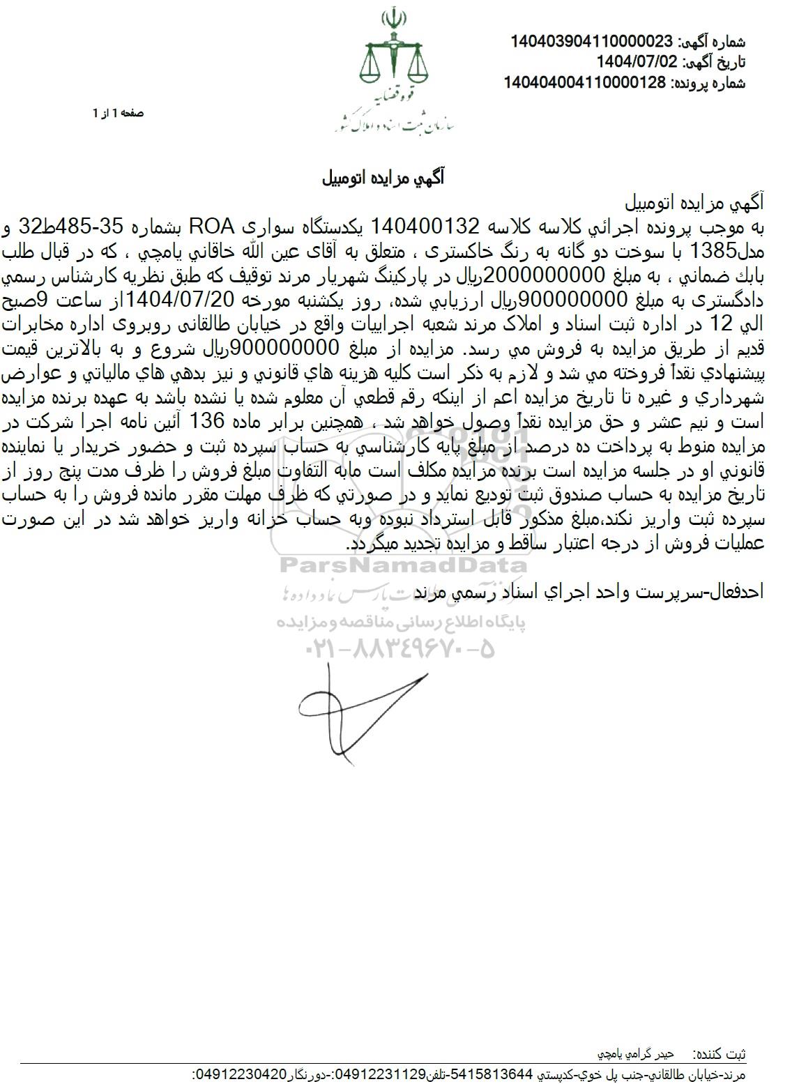 به موجب پرونده اجرائی كلاسه كلاسه 140400132 یکدستگاه سواری ROA بشماره 35-32485 و مدل 1385 با سوخت دو گانه به رنگ خاکستری ، متعلق به آقای عین الله خاقانی يامچی ، که در قبال طلب بابک ضمانی ، به مبلغ 2000000000 ریال در پارکینگ شهریار مرند توقیف که طبق نظریه کارشناس رسمي دادگستری به مبلغ 900000000 ريال ارزيابي شده روز یکشنبه مورخه 1404.07.20 از ساعت 9 صبحالي 12 در اداره ثبت اسناد و املاک مرند شعبه اجراییات واقع در خیابان طالقانی روبروی اداره مخابرات قدیم از طریق مزایده به فروش میرسد مزایده از مبلغ 900000000 ريال شروع و به بالاترین قیمت پيشنهادی نقداً فروخته می شد و لازم به ذکر است کلیه هزینه های قانونی و نيز بدهی های مالياتی و عوارض شهرداری و غیره تا تاریخ مزایده اعم از اینکه رقم قطعي آن معلوم شده یا نشده باشد به عهده برنده مزایده است و نیم عشر و حق مزایده نقداً وصول خواهد شد، همچنین برابر ماده 136 آئین نامه اجرا شرکت در مزایده منوط به پرداخت ده درصد از مبلغ پایه کارشناسی به حساب سپرده ثبت و حضور خریدار یا نماینده قانوني او در جلسه مزایده است برنده مزایده مکلف است ما به التفاوت مبلغ فروش را ظرف مدت پنج روز از تاریخ مزایده به حساب صندوق ثبت تودیع نماید و در صورتی که ظرف مهلت مقرر مانده فروش را به حساب سپرده ثبت واریز نکند مبلغ مذکور قابل استرداد نبوده و به حساب خزانه واریز خواهد شد در این صورت عملیات فروش از درجه اعتبار ساقط و مزایده تجدید میگردد.