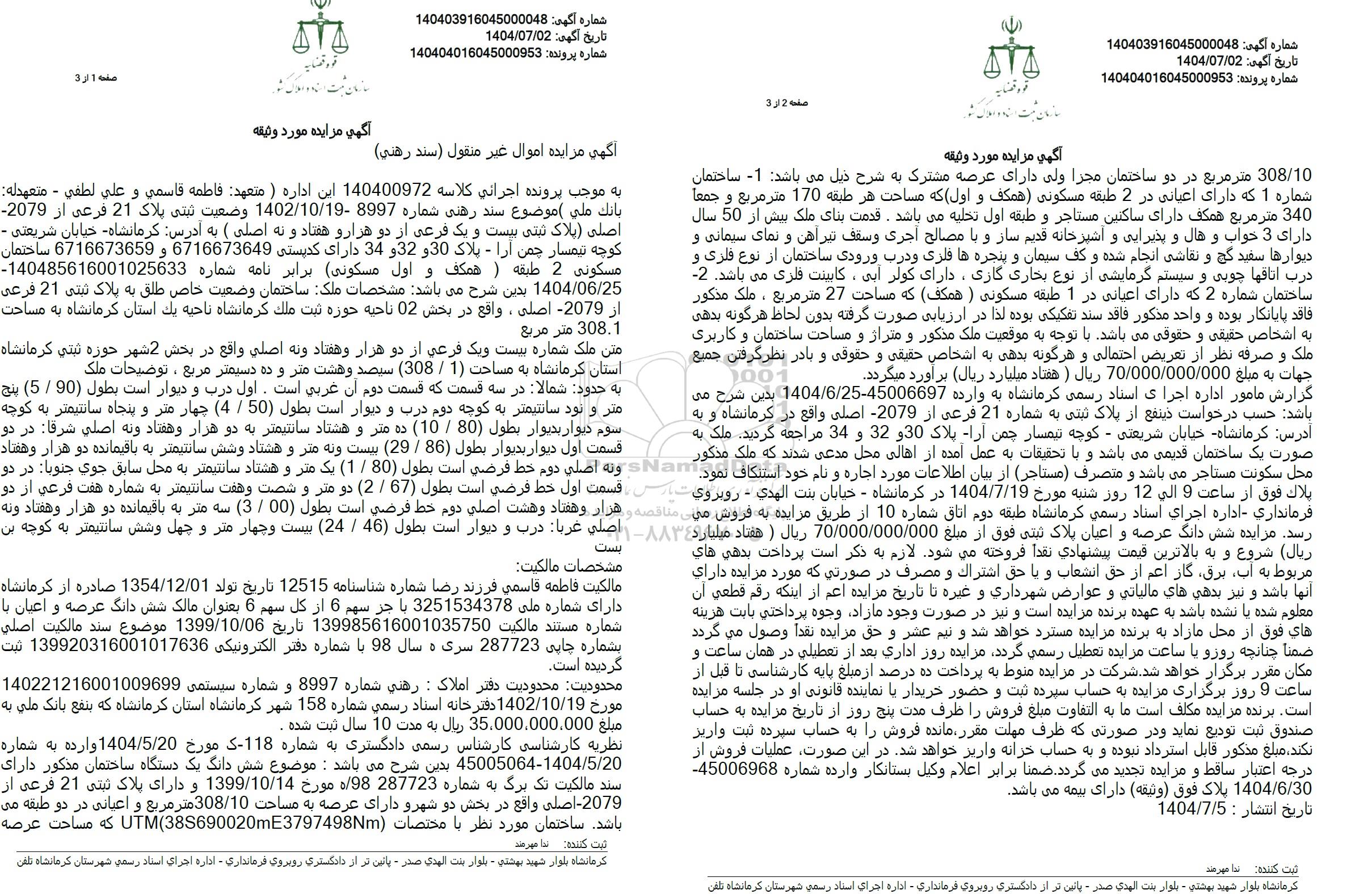 به موجب پرونده اجرائی کلاسه 140400972 این اداره ( متعهد: فاطمه قاسمی و على لطفی - متعهدله: بانک ملی موضوع سند رهنی شماره 8997 1402.10.19 وضعیت ثبتی پلاک 21 فرعی از 2079 اصلی پلاک ثبتی بیست و یک فرعی از دو هزار و هفتاد و نه اصلی ) به آدرس کرمانشاه- خیابان شریعتی -کوچه تیمسار چمن آرا - پلاک 30 و 32 و 34 دارای کدیستی 6716673649 و 6716673659 ساختمان مسکونی 2 طبقه ) همکف و اول مسکونی برابر نامه شماره 140485616001025633 1404.06.25 بدین شرح می باشد مشخصات ملک ساختمان وضعیت خاص طلق به پلاک ثبتی 21 فرعی از 2079 اصلی، واقع در بخش 02 ناحیه حوزه ثبت ملک کرمانشاه ناحیه یک استان کرمانشاه به مساحت 308.1 متر مربع متن ملک شماره بیست و یک فرعی از دو هزار و هفتاد و نه اصلی واقع در بخش 2 شهر دوره ثبتی کرمانشاه استان کرمانشاه به مساحت (1) . 308) سیصد و هشت متر و ده دسیمتر مربع ، توضیحات ملک به حدود شمالا در سه قسمت که قسمت دوم آن عربی است. اول درب و دیوار است بطول (90 . 5) پنج متر و نود سانتیمتر به کوچه دوم درب و دیوار است بطول (50) . (4 چهار متر و پنجاه سانتیمتر به کوچه سوم دیوار بدیوار بطول (80) . (10) ده متر و هشتاد سانتیمتر به دو هزار و هفتاد و نه اصلی شرقا در دو قسمت اول دیوار بدیوار بطول (86) . (29) بیست و نه متر و هشتاد و شش سانتیمتر به باقیمانده دو هزار و هفتاد ونه اصلی دوم خط فرضی است بطول 80.(1) یک متر و هشتاد سانتیمتر به محل سابق جوی جنوبا در دو قسمت اول خط فرضی است بطول (67).(2) دو متر و شصت و هفت سانتیمتر به شماره هفت فرعی از دو هزار و هفتاد و هشت اصلی دوم خط فرضی است بطول 00 . (3) سه متر به باقیمانده دو هزار و هفتاد و نه اصلی غربا درب و دیوار است بطول (46) . (24) بیست و چهار متر و چهل و شش سانتیمتر به کوچه بن بست