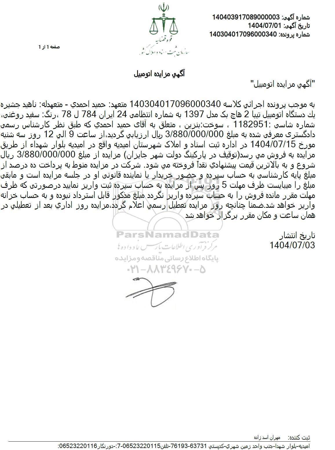 به موجب پرونده اجرائی کلاسه 140304017096000340 متعهد حمید احمدی - متعهدله ناهید جشیره یک دستگاه اتومبیل تیبا 2 هاچ بک مدل 1397 به شماره انتظامی 24 ایران 784 ل 78 ، رنگ سفید روغنی شماره شاسی : 1182951 ، سوخت بنزین، متعلق به آقای حمید احمدی که طبق نظر کارشناس رسمی دادگستری معرفی شده به مبلغ 3.880.000.000 ریال ارزیابی گردید از ساعت 9 الی 12 روز سه شنبه مورخ 1404.07.15 در اداره ثبت اسناد و املاک شهرستان امیدیه واقع در امیدیه بلوار شهداء از طریق مزایده به فروش می رسد توقیف در پارکینگ دولت شهر (جایزان مزایده از مبلغ 3.880.000.000 ریال شروع و به بالاترین قیمت پیشنهادی نقداً فروخته میشود شرکت در مزایده منوط به پرداخت ده درصد از مبلغ پایه کارشناسی به حساب سپرده و حضور خریدار یا نماینده قانونی او در جلسه مزایده است و مابقی مبلغ را میبایست ظرف مهلت 5 روز پس از مزایده به حساب سپرده ثبت واریز نمایید در صورتی که ظرف مهلت مقرر مانده فروش را به حساب سپرده واریز نگردد مبلغ مذکور قابل استرداد نبوده و به حساب خزانه واریز خواهد شد. ضمنا چنانچه روز مزایده تعطیل رسمی اعلام گردد مزایده روز اداری بعد از تعطیلی در همان ساعت و مکان مقرر برگزار خواهد شد