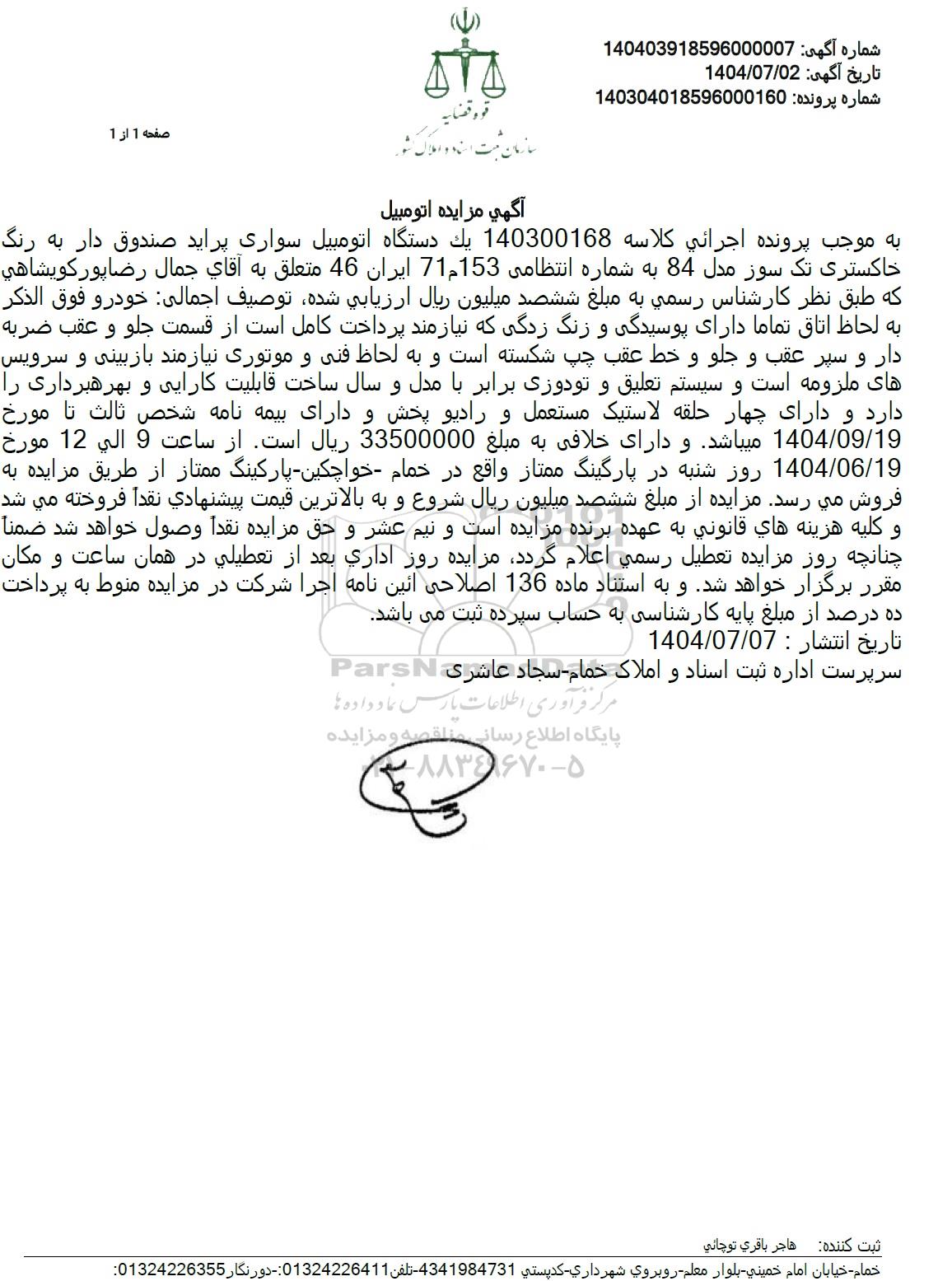 به موجب پرونده اجرائي كلاسه 140300168 يک دستگاه اتومبیل سواری پراید صندوق دار به رنگ خاکستری تک سوز مدل 84 به شماره انتظامی 153م 71 ایران 46 متعلق به آقاي جمال رضا پور كويشاهي که طبق نظر کارشناس رسمي به مبلغ ششصد میلیون ریال ارزيابي شده توصیف اجمالی خودرو فوق الذکر به لحاظ اتاق تماما دارای پوسیدگی و زنگ زدگی که نیازمند پرداخت کامل است از قسمت جلو و عقب ضربه دار و سپر عقب و جلو و خط عقب چپ شکسته است و به لحاظ فنی و موتوری نیازمند بازبینی و سرویس های ملزومه است و سیستم تعلیق و تودوزی برابر با مدل و سال ساخت قابلیت کارایی و بهرهبرداری را دارد و دارای چهار حلقه لاستیک مستعمل و رادیو پخش و دارای بیمه نامه شخص ثالث تا مورخ 1404.09.19 میباشد و دارای خلافی به مبلغ 33500000 ریال است. از ساعت 9 الی12 مورخ 1404.06.19 روز شنبه در پارگینگ ممتاز واقع در حمام خواچکین - پارکینگ ممتاز از طریق مزایده به فروش مي رسد. مزایده از مبلغ ششصد میلیون ریال شروع و به بالاترین قیمت پیشنهادی نقداً فروخته می شد و کلیه هزينه های قانونی به عهده برنده مزایده است و نیم عشر و حق مزایده نقداً وصول خواهد شد ضمناً چنانچه روز مزایده تعطیل رسمی اعلام گردد مزایده روز اداری بعد از تعطیلی در همان ساعت و مکان مقرر برگزار خواهد شد و به استناد ماده 136 اصلاحی آئین نامه اجرا شرکت در مزایده منوط به پرداخت ده در صد از مبلغ پایه کارشناسی به حساب سپرده ثبت می باشد.
