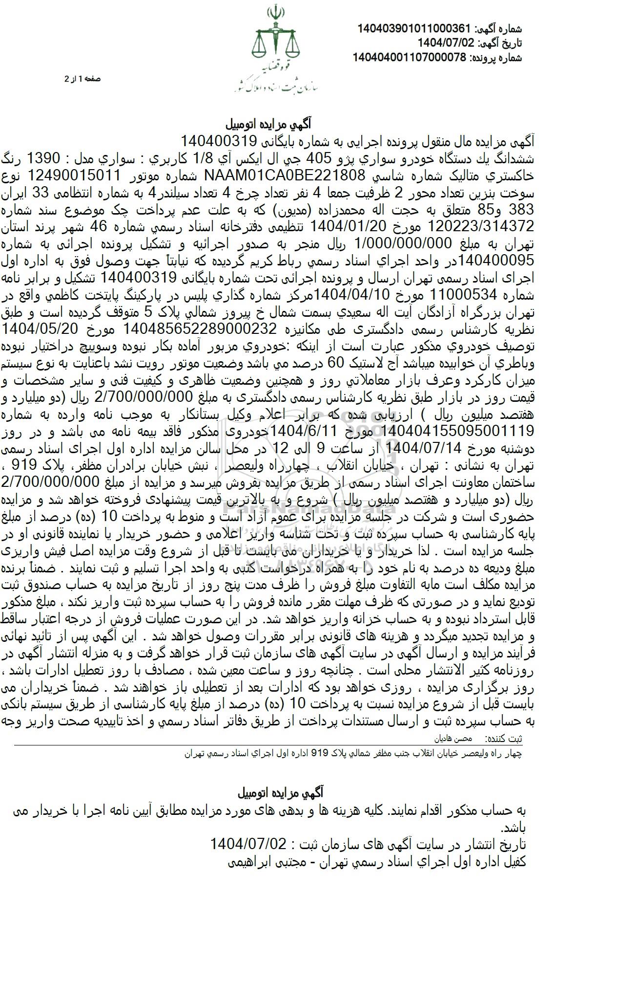 ششدانگ یک دستگاه خودرو سواری پژو 405 جی ال ايكس آی 1.8 كاربري : سواری مدل : 1390 رنگ شماره موتور 12490015011 نوع NAAM01CA0BE221808 خاکستری متالیک شماره شاسي سوخت بنزین تعداد محور 2 ظرفیت جمعا 4 نفر تعداد چرخ 4 تعداد سیلندر 4 به شماره انتظامی 33 ایران 383 و 85 متعلق به حجت اله محمد زاده مدیون) که به علت عدم پرداخت چک موضوع سند شماره 120223.314372 مورخ 1404.01.20 تنظیمی دفترخانه استاد رسمی شماره 46 شهر پرند استان تهران به مبلغ 1.000.000.000 ریال منجر به صدور اجرائیه و تشکیل پرونده اجرائی به شماره 1 در واحد اجراي اسناد رسمی رباط کریم گردیده که نیابتا جهت وصول فوق به اداره اول اجرای اسناد رسمی تهران ارسال و پرونده اجرائی تحت شماره بایگانی 140400319 تشکیل و برابر نامه شماره 11000534 مورخ 1404.04.10 مرکز شماره گذاری پلیس در پارکینگ پایتخت کاظمی واقع در تهران بزرگراه آزادگان آیت اله سعيدي بسمت شمال خ پیروز شمالی پلاک 5 متوقف گردیده است و طبق 140400095 در 1404.05.20 نظریه کارشناس رسمی دادگستری طی مکانیزه 140485652289000232 مورخ توصیف خودروی مذکور عبارت است از اینکه خودروی مزبور آماده بکار نبوده و سوییچ در اختیار نبوده وباطري أن آن خوابیده میباشد آج ! آج لاستیک 60 درصد می باشد وضعیت موتور رویت نشد با عنایت به نوع سیستم میزان کارکرد و عرف بازار معاملاتی روز و همچنین وضعیت ظاهری و کیفیت فنی و سایر مشخصات و قیمت روز در بازار طبق نظریه کارشناس رسمی دادگستری به مبلغ 2.700.000.000 ریال دو میلیارد و هفتصد میلیون ریال ( ارزیابی شده که برابر اعلام وکیل بستانکار به موجب نامه وارده به شماره 140404155095001119 مورخ 1404.6.11 خودروی مذکور فاقد بیمه نامه می باشد و در روز دوشنبه مورخ 1404.07.14 از ساعت 9 الی 12 در محل سالن مزایده اداره اول اجرای اسناد رسمی تهران به نشانی : تهران ، خیابان انقلاب ، چهار راه ولیعصر ، نبش خیابان برادران مظفر پلاک 919 . ساختمان معاونت اجرای اسناد رسمی از طریق مزایده بفروش میرسد و مزایده از مبلغ 2.700.000.000 ریال دو میلیارد و هفتصد میلیون ریال ) شروع و به بالاترین قیمت پیشنهادی فروخته خواهد شد و مزایده حضوری است و شرکت در جلسه مزایده برای عموم آزاد است و منوط به پرداخت 10 (ده) درصد از مبلغ پایه کارشناسی به حساب سپرده ثبت و تحت شناسه واریز اعلامی و حضور خریدار یا نماینده قانونی او در جلسه مزایده است . لذا خریدار و یا خریداران میبایست تا قبل از شروع وقت مزایده اصل فیش واریزی مبلغ ودیعه ده درصد به نام خود را به همراه درخواست کتبی به واحد اجرا تسلیم و ثبت نمایند . ضمنا برنده مزایده مکلف است ما به التفاوت مبلغ فروش را ظرف مدت پنج روز از تاریخ مزایده به حساب صندوق ثبت تودیع نماید و در صورتی که ظرف مهلت مقرر مانده فروش را به حساب سپرده ثبت واریز نکند ، مبلغ مذکور قابل استرداد نبوده و به حساب خزانه واریز خواهد شد. در این صورت عملیات فروش از درجه اعتبار ساقط و مزایده تجدید میگردد و هزینه های قانونی برابر مقررات وصول خواهد شد. این آگهی پس از تائید نهایی فرآیند مزایده و ارسال آگهی در سایت آگهی های سازمان ثبت قرار خواهد گرفت و به منزله انتشار آگهی در روزنامه کثیر الانتشار محلی است. چنانچه روز و ساعت معین شده ، مصادف با روز تعطیل ادارات باشد . روز برگزاری مزایده، روزی خواهد بود که ادارات بعد از تعطیلی باز خواهند شد. ضمنا خریداران می بایست قبل از شروع مزایده نسبت به پرداخت 10 (ده) درصد از مبلغ پایه کارشناسی از طریق سیستم بانکی به حساب سپرده ثبت و ارسال مستندات پرداخت از طریق دفاتر اسناد رسمي و اخذ تاییدیه صحت واریز وجه