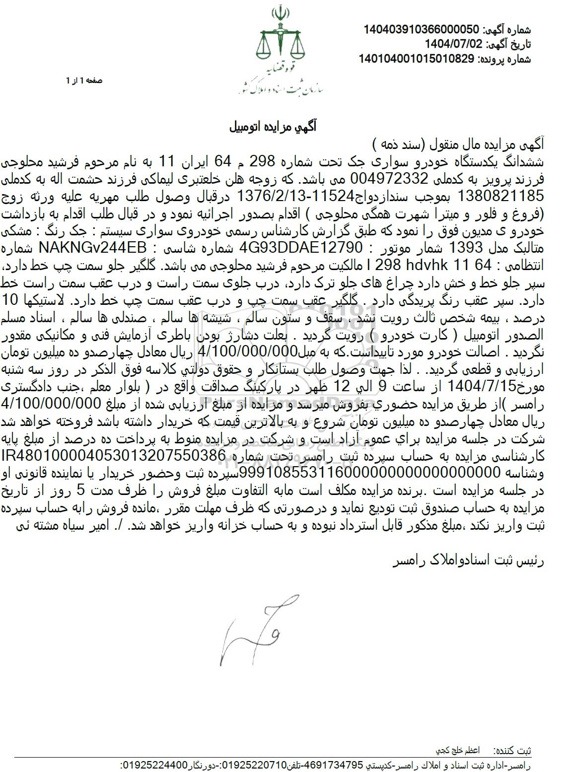ششدانگ یکدستگاه خودرو سواری جک تحت شماره 298م 64 ایران 11 به نام مرحوم فرشید محلوجی فرزند پرویز به کدملی 004972332 می باشد که زوجه هلن خلعتبری لیماکی فرزند حشمت اله به کدملی 1380821185 بموجب سند ازدواج 11524-1376.2.13 در قبال وصول طلب مهريه عليه ورثه زوج فروغ و فلور و میترا شهرت همگی محلوجی ( اقدام بصدور اجرائیه نمود و در قبال طلب اقدام به بازداشت خودروی مدیون فوق را نمود که طبق گزارش کارشناس رسمی خودروی سواری سیستم : جک رنگ : مشکی متالیک مدل 1393 شمار موتور : 4G93DDAE12790 شماره شاسی : NAKNGv244EB شماره انتظامی : 1164 29 مالكيت مرحوم فرشید محلوجی میباشد گلگیر جلو سمت چپ خط دارد. سپر جلو خط و خش دارد چراغهای جلو ترک دارد درب جلوی سمت راست و درب عقب سمت راست خط دارد. سپر عقب رنگ پریدگی دارد. گلگیر عقب سمت چپ و درب عقب سمت چپ خط دارد. لاستیکها 10 درصد ، بیمه شخص ثالث رویت نشد ، سقف و ستون سالم ، شیشه ها سالم ، صندلی ها سالم ، استاد مسلم الصدور اتومبيل ( كارت خودرو ( رویت گردید. بعلت دشارژ بودن باطری آزمایش فنی و مکانیکی مقدور نگردید . اصالت خودرو مورد تایید است که به مبل 4.100.000.000 ریال معادل چهار صدو ده میلیون تومان ارزیابی و قطعی گردید . لذا جهت وصول طلب بستانکار و حقوق دولتي كلاسه فوق الذکر در روز سه شنبه مورخ 1404.7.15 از ساعت 9 الی 12 ظهر در پارکینگ صداقت واقع در ) بلوار معلم ، جنب دادگستری رامسر ( از طریق مزایده حضوري بفروش میرسد و مزایده از مبلغ ارزیابی شده از مبلغ 4/100/000/000 ریال معادل چهار صد و ده میلیون تومان شروع و به بالاترین قیمت که خریدار داشته باشد فروخته خواهد شد شرکت در جلسه مزایده برای عموم آزاد است و شرکت در مزایده منوط به پرداخت ده درصد از مبلغ پایه کارشناسی مزایده به حساب سپرده ثبت رامسر تحت شماره IR480100004053013207550386 و شناسه 999108553116000000000000000000 سپرده ثبت و حضور خریدار یا نماینده قانونی او در جلسه مزایده است. برنده مزایده مکلف است ما به التفاوت مبلغ فروش را ظرف مدت 5 روز از تاریخ مزایده به حساب صندوق ثبت تودیع نماید و در صورتی که ظرف مهلت مقرر مانده فروش را به حساب سپرده ثبت واریز نکند ، مبلغ مذکور قابل استرداد نبوده و به حساب خزانه واریز خواهد شد / امیر سیاه مشته ئی