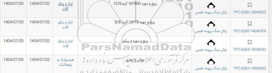 | TPC-6283-14040362 | زغال سنگ پروده طبس | بوش و مغزی | هیدرولیک و پنوماتیک | 1404.7.2 | 1404.7.5 |
