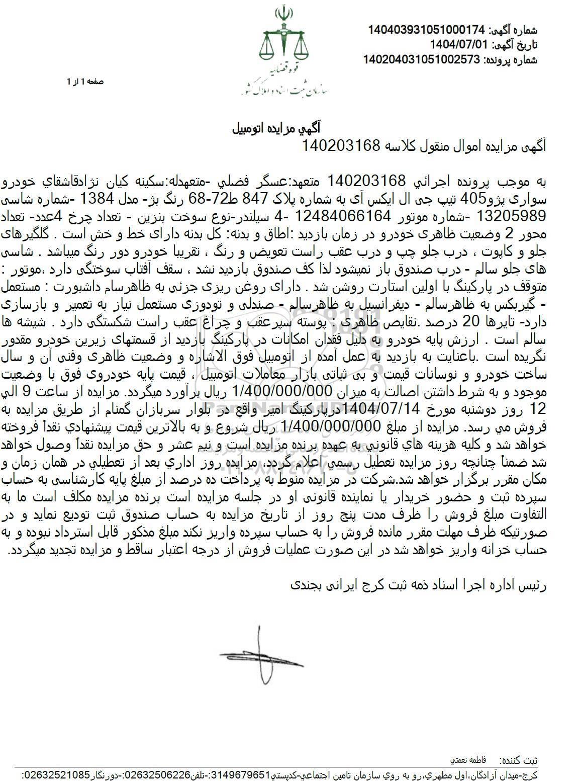به موجب پرونده اجرائی 140203168 متعهد عسگر فضلی متعهدله : سكینه كیان نژاد قاشقای خودرو سواری پژو 405 تیپ جی ال ایکس آی به شماره پلاک 847 72- رنگ بژ مدل 1384 - شماره شاسی 13205989 شماره موتور 12484066164 4 سیلندر نوع سوخت بنزین - تعداد چرخ 4 عدد تعداد محور 2 وضعیت ظاهری خودرو در زمان بازدید اطاق و بدنه کل بدنه دارای خط و خش است . گلگیرهای جلو و کاپوت ، درب جلو چپ و درب عقب راست تعویض و رنگ ، تقریبا خودرو دور رنگ میباشد . شاسی های جلو سالم - درب صندوق باز نمیشود لذا کف صندوق بازدید نشد ، سقف آفتاب سوختگی دارد ، موتور : متوقف در پارکینگ با اولین استارت روشن شد. دارای روغن ریزی جزئی به ظاهر سام داشبورت : مستعمل - گیربکس به ظاهر سالم - دیفرانسیل به ظاهر سالم - صندلی و تودوزی مستعمل نیاز به تعمیر و بازسازی دارد تایرها 20 درصد نقایص ظاهری : پوسته سپر عقب و چراغ عقب راست شکستگی دارد . شیشه ها سالم است . ارزش پایه خودرو به دلیل فقدان امکانات در پارکینگ بازدید از قسمتهای زیرین خودرو مقدور نگریده است با عنایت به بازدید به عمل آمده از اتومبیل فوق الاشاره و وضعیت ظاهری وفنی آن و سال ساخت خودرو و نوسانات قیمت و بی ثباتی بازار معاملات اتومبیل ، قیمت پایه خودروی فوق با وضعیت موجود و به شرط داشتن اصالت به میزان 1.400.000.000 ریال برآورد میگردد. مزایده از ساعت 9 الی 12 روز دوشنبه مورخ 1404.07.14 در پارکینگ امیر واقع در بلوار سربازان گمنام از طریق مزایده به فروش میرسد مزایده از مبلغ 1.400.000.000 ریال شروع و به بالاترین قیمت پیشنهادی نقدا فروخته خواهد شد و کلیه هزینه های قانونی به عهده برنده مزایده است و نیم عشر و حق مزایده نقداً وصول خواهد شد ضمنا چنانچه روز مزایده تعطیل رسمی اعلام گردد مزایده روز اداری بعد از تعطیلی در همان زمان و مكان مقرر برگزار خواهد شد. شرکت در مزایده منوط به پرداخت ده درصد از مبلغ پایه کارشناسی به حساب سپرده ثبت و حضور خریدار یا نماینده قانونی او در جلسه مزایده است برنده مزایده مکلف است ما به التفاوت مبلغ فروش را ظرف مدت پنج روز از تاریخ مزایده به حساب صندوق ثبت تودیع نماید و در صورتیکه ظرف مهلت مقرر مانده فروش را به حساب سپرده واریز نکند مبلغ مذکور قابل استرداد نبوده و به حساب خزانه واریز خواهد شد در این صورت عملیات فروش از درجه اعتبار ساقط و مزایده تجدید میگردد.