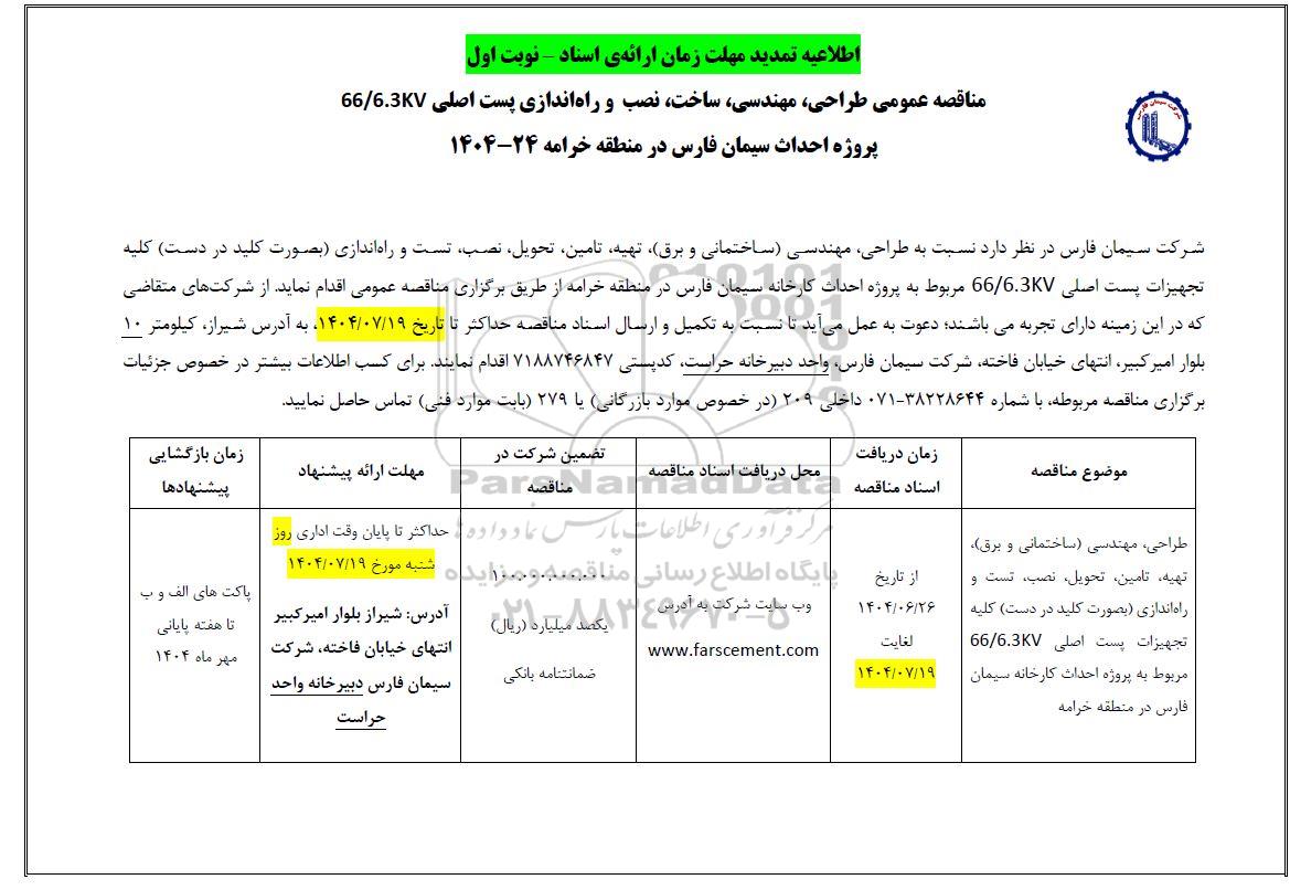 مناقصه عمومی طراحی ، مهندسی ، ساخت، نصب و راه اندازی پست اصلی 66/6.3kv پروژه احداث سیمان فارس در منطقه خرامه 24- 1404