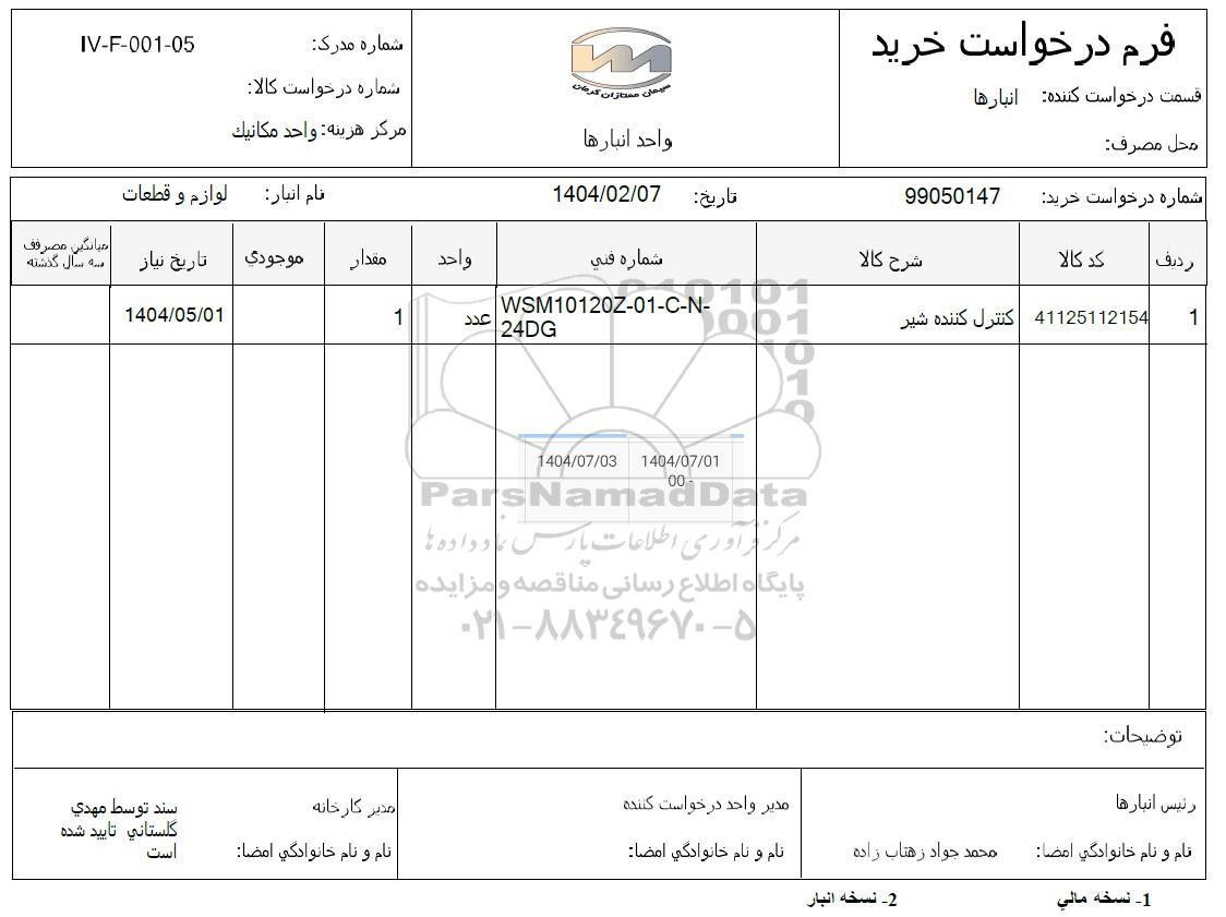 | 1 | 41125112154 | کنترل کننده شیر | WSM10120Z-01-C-N-24DG | عدد | 1 | 1404.05.01 |