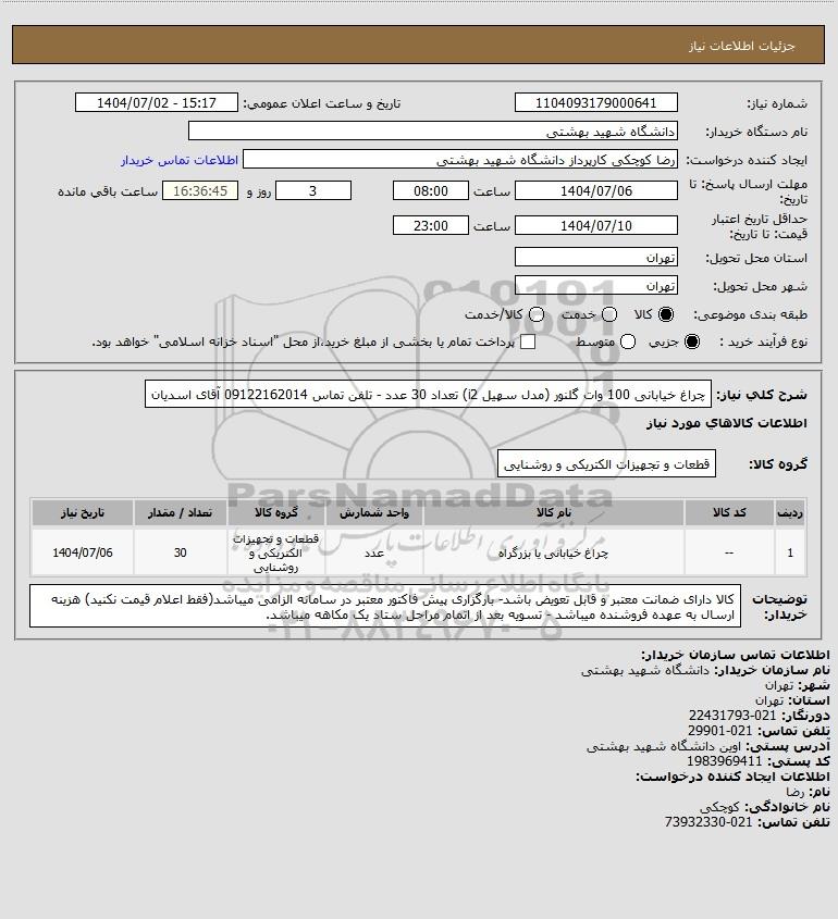 شرح کلی نیاز: چراغ خیابانی 100 وات گلنور (مدل سهیل i2) تعداد 30 عدد - تلفن تماس 09122162014 آقای اسدیان