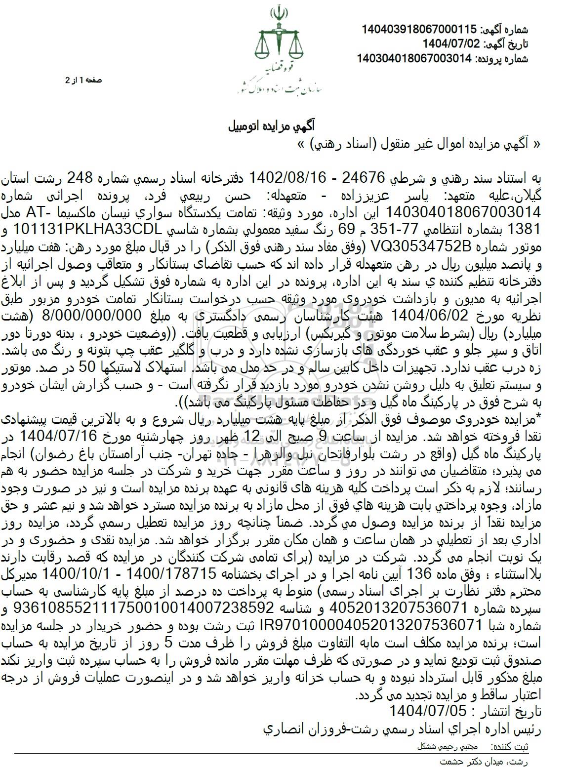 به استناد سند رهنی و شرطی 24676 - 1402.08.16 دفترخانه اسناد رسمی شماره 248 رشت استان گیلان، علیه متعهد یاسر عزیز زاده متعهدله حسن ربیعی فرد پرونده اجرائی شماره 140304018067003014 این اداره مورد وثیقه تمامت یکدستگاه سواری نیسان ماكسیما - AT مدل 1381 بشماره انتظامی 77-351 م 69 رنگ سفید معمولی بشماره شاسی 101131PKLHA33CDL و موتور شماره Q30534752 وفق مفاد سند رهنی فوق الذكر را در قبال مبلغ مورد رهن هفت میلیارد و پانصد میلیون ریال در رهن متعهدله قرار داده اند که حسب تقاضای بستانکار و متعاقب وصول اجرائیه از دفترخانه تنظیم کننده ی سند به این اداره پرونده در این اداره به شماره فوق تشکیل گردید و پس از ابلاغ اجرائیه به مدیون و بازداشت خودروی مورد وثیقه حسب درخواست بستانکار تمامت خودرو مزبور طبق نظریه مورخ 1404.06.02 هیئت کارشناسان رسمی دادگستری به مبلغ 8.000.000.000 (هشت میلیارد) ریال (بشرط سلامت موتور و گیربکس ) ارزیابی و قطعیت یافت وضعیت خودرو ، بدنه دور تا دور اتاق و سپر جلو و عقب خوردگیهای بازسازی نشده دارد و درب و گلگیر عقب چپ بتونه و رنگ می باشد. زه درب عقب ندارد. تجهیزات داخل کابین سالم و در حد مدل می باشد. استهلاک لاستیکها 50 در صد. موتور و سیستم تعلیق به دلیل روشن نشدن خودرو مورد بازدید قرار نگرفته است - و حسب گزارش ایشان خودرو به شرح فوق در پارکینگ ماه گیل و در حفاظت مسئول پارکینگ می باشد.