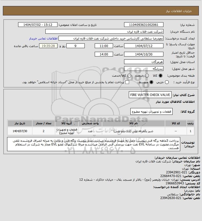 شرح کلی نیاز: FIRE WATER CHECK VALVE