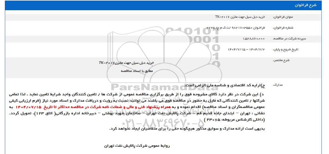 علاقهمندان میتوانند جهت دریافت اسناد و اطلاعات تکمیلی، فراخوان خرید دبل سیل جهت مخزن 2016 - TK با سامانه مناقصات و مزایدات ایران پارسنماد داده ها 88349670 تماس حاصل نمایند.