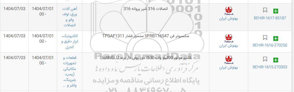 | BEHIR-1617-85187 | بهنوش ایران | اتصالات 316 شیر پروانه 316 | آهن الات ورق لوله والو و اتصالات | 1404.07.01 | 1404.07.03 |
