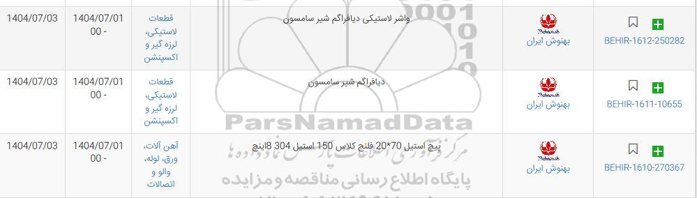 | BEHIR-1611-10655 | بهنوش ایران | دیافراگم شیر سامسون | قطعات لاستیکی و لرزه گیر اکسپنشن | 1404.07.01 | 1404.7.3 |