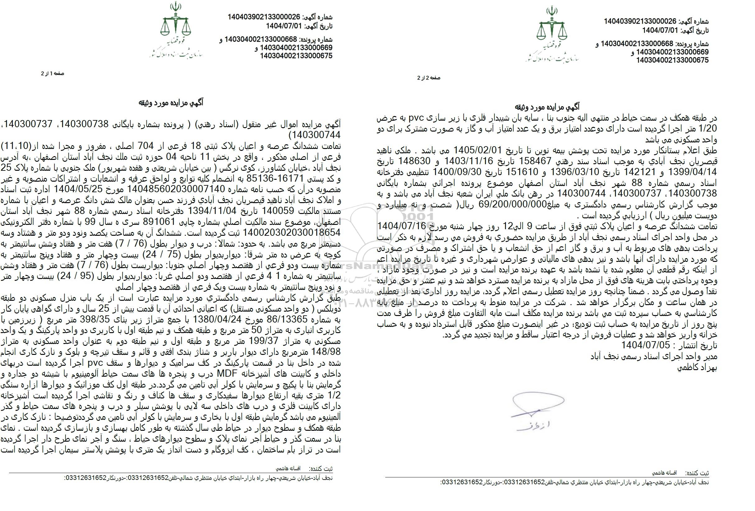 آگهی مزایده اموال غیر منقول اسناد رهني) ( پرونده بشماره بایگانی 140300738، 140300737 (140300744
